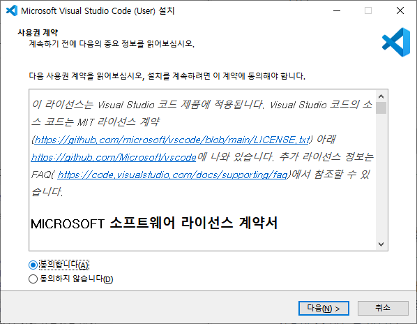 사용하기 위해 설치하는 부분이니 "사용권 계약"은 "동의합니다(A)"로 선택해주고 "다음" 버튼을 눌러 진행합니다.
