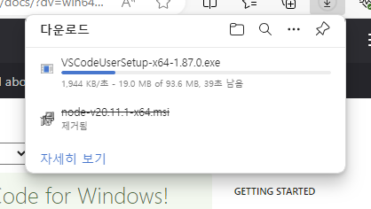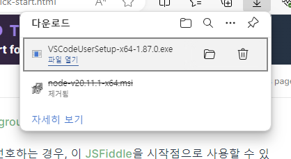 버튼을 클릭하고 나면, 아래 그림처럼 "VSCodeUserSetup-x64-1.87.0.exe" 파일이 다운로드 되고요.