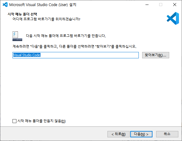 프로그램 바로가기를 위치할 시작 메뉴 폴더 선택을 합니다. 이것도 기본으로 지정된 Visual Studio Code로 두고 "다음"을 눌러 진행합니다.