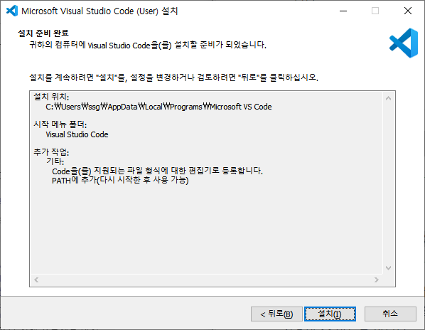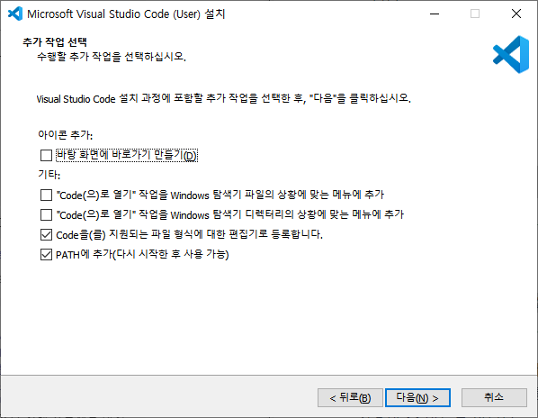 다음은 추가 작업으로 선택하는 영역인데요. Code가 지원되는 파일 형식에 편집기로 기본적으로 사용하는 옵션과 PATH에 추가 하는 옵션들이 있습니다. 당연하겠지만 환경설정과 관련된 path 설정은 PC를 다시시작해야 진행 가능합니다.