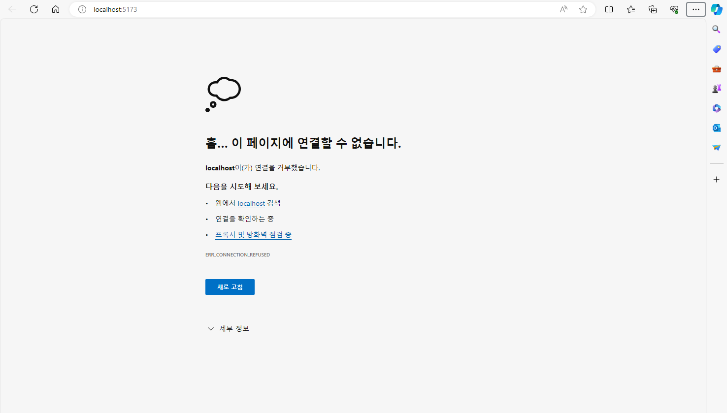 궁금해서 기존에 띄워놓은 브라우져로, 바로 F5를 툴러 리프레쉬 해봤는데요. 아래와 같이 페이지가 바로 뜨지는 않았습니다. 아마도 서버의 메인 페이지를 건드리면 기동한 서버가 자동으로 내려가나 봅니다...
