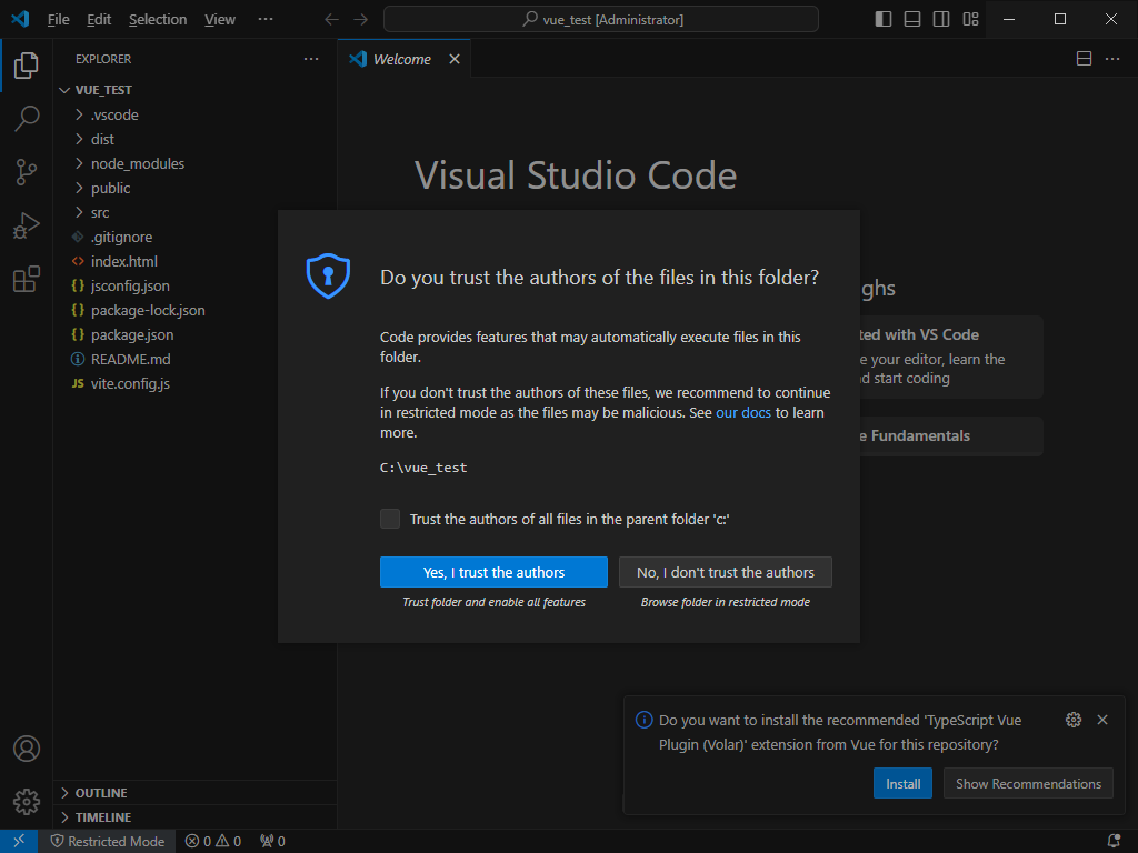 지난 포스팅에서 생성한 C:\vue_test 프로젝트 폴더를 열어줍니다. 그러면 아래와 같이 팝업이 뜨는데요.