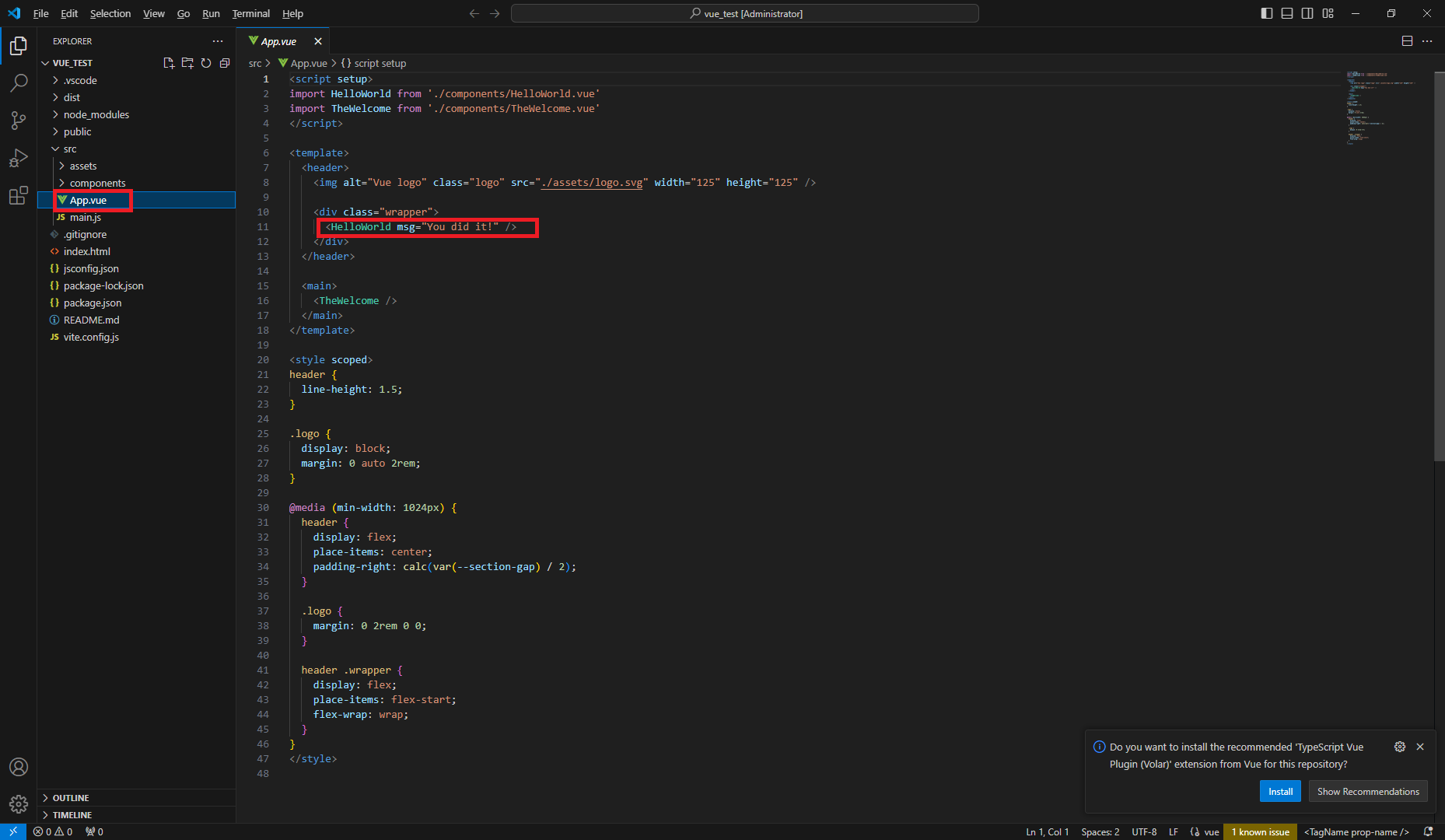이제 코딩 및 테스트를 위해 메인 파일인 vue_test > App.vue 파일을 열어 보면, 기존 포스팅에서 확인한 로컬 호스트 서버에서 표시되는 메인 페이지의 파일인 것을 알 수 있습니다. "You did it!" 문구를 통해서 말이죠.