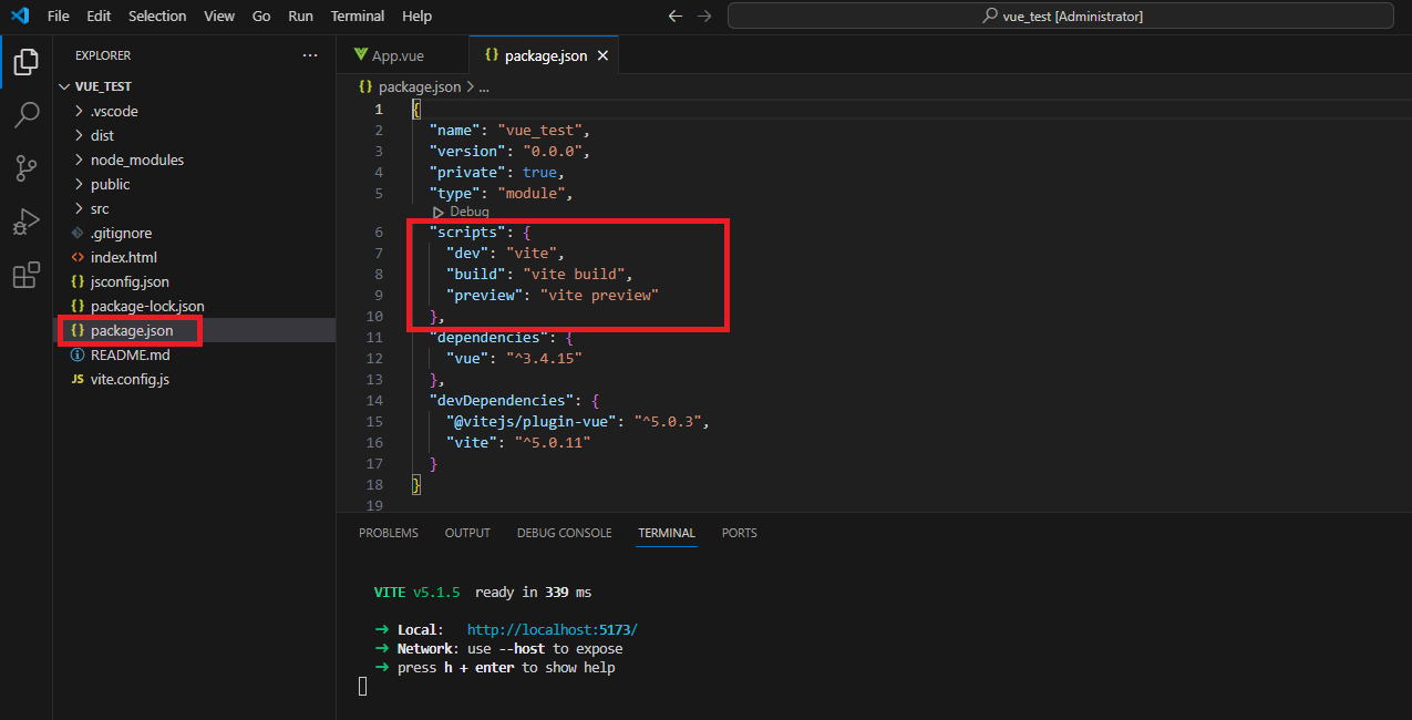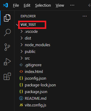 프로젝트 폴더의 내부를 살펴보면 아래와 같은데요. 생성한 vue_test 폴더 내부에 각 종 소스와 패키지들이 들어있는 것을 알 수 있습니다.