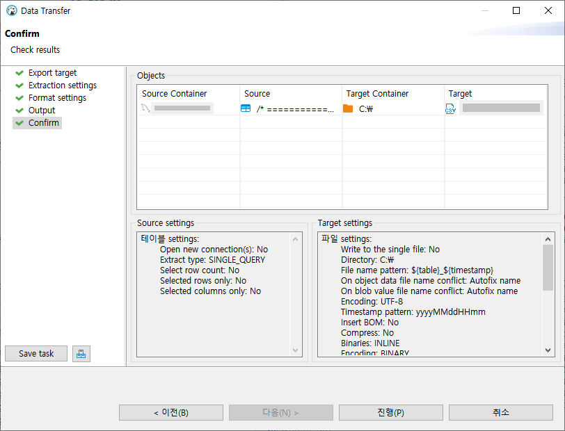 다음 단계는 Extraction settings로 다양한 추출 옵션을 설정할 수 있는데요. Open new connection(s) : 신규 커넥션을 연결해 할것인지, Select row count : 줄번호를 나타나게 할 것인지, Fetch size : 10000 등 등을 선택할 수 있습니다.