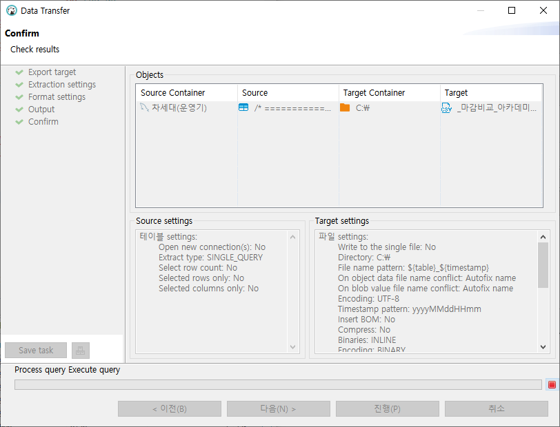 추출된 데이터 파일명의 기본적인 옵션은 테이블 명에 추출한 시간이 붙도록 설정되어 있고, 별도로 수정할 내역은 없으니 "다음"을 눌러 진행합니다.