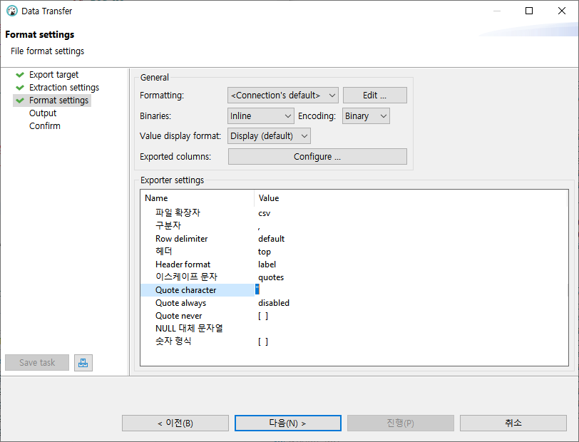 그 다음은 Format settings 옵션을 선택하게 되는데요. 구분자를 다른 문자로 대체할 수 있게 구성되어 있고 각 종 특수문자들을 어떻게 추출할 것인지를 정의할 수 있습니다.