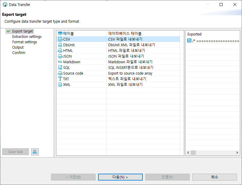 추출할 파일의 양식을 먼저 정의합니다. 이번에는 CSV 파일로 내릴 예정이기 때문에 CSV Export target을 선택합니다. 참고로 CSV는 Comma Separeated Value로 데이터가 ,로 구분된 값이라고 보면 됩니다.