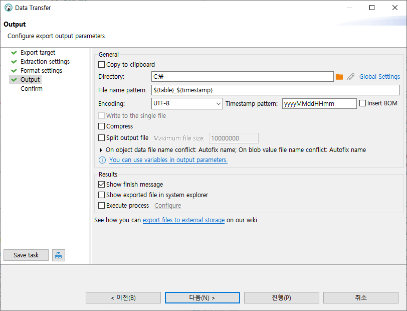 그 다음은 Output 옵션으로 데이터를 추출한 파일이 어느 경로에 어떤 형식으로 지정할 것인지 정의하는 부분입니다. Directory쪽에 경로를 설정하고, File name pattern에서 해당 파일의 형식을 어떻게 할 것인지 정의합니다.