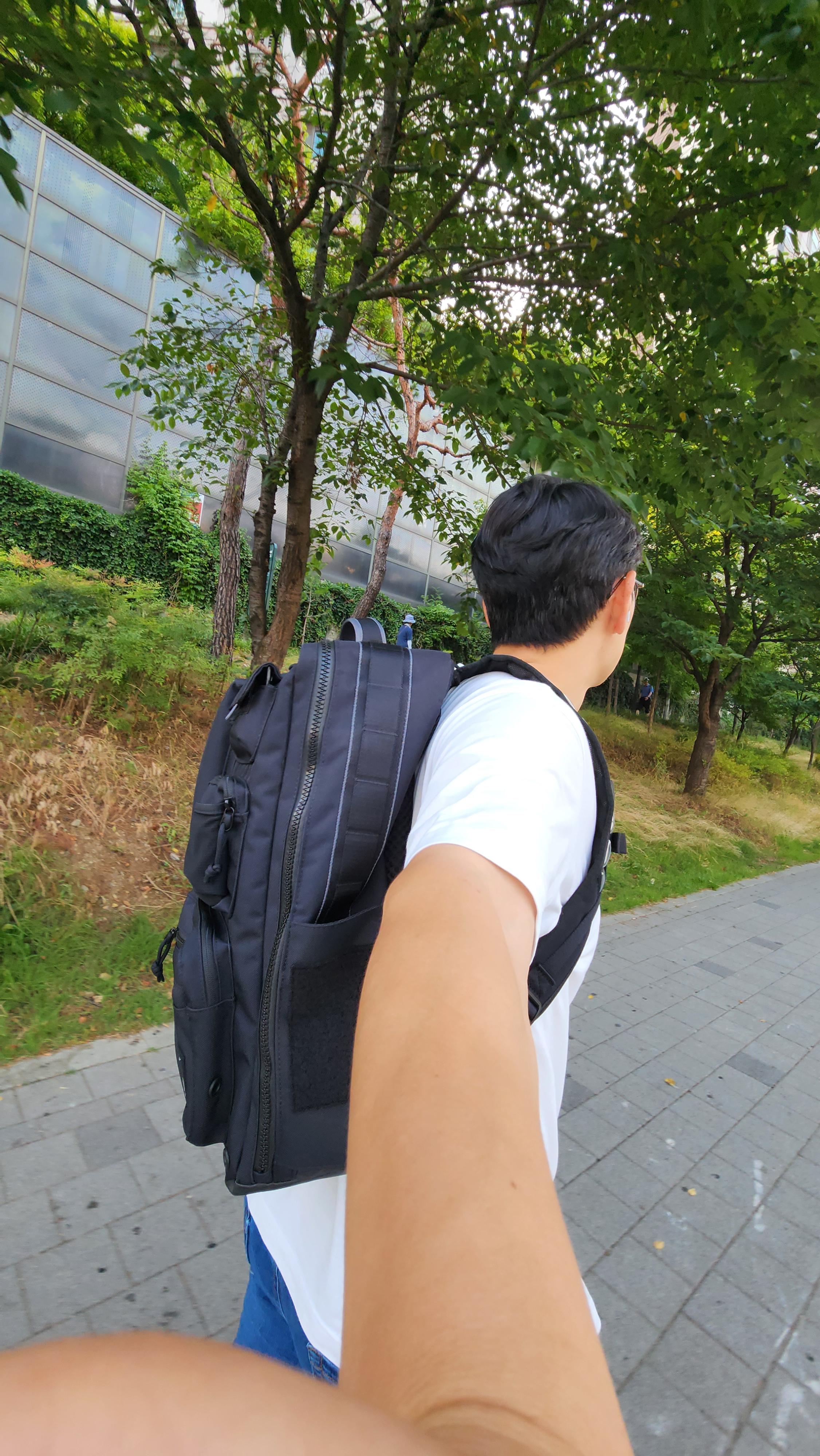 그럼 출근을 하면서 등에 착용을 해봤는데요. 가방이 꽤나 커서 등을 시원하게 다 덮어 줍니다. 지금 날씨가 초여름이라 덥지만 등부분이 공기가 통할 수 있도록 되어 있어서 상대적으로 덜 덥습니다.