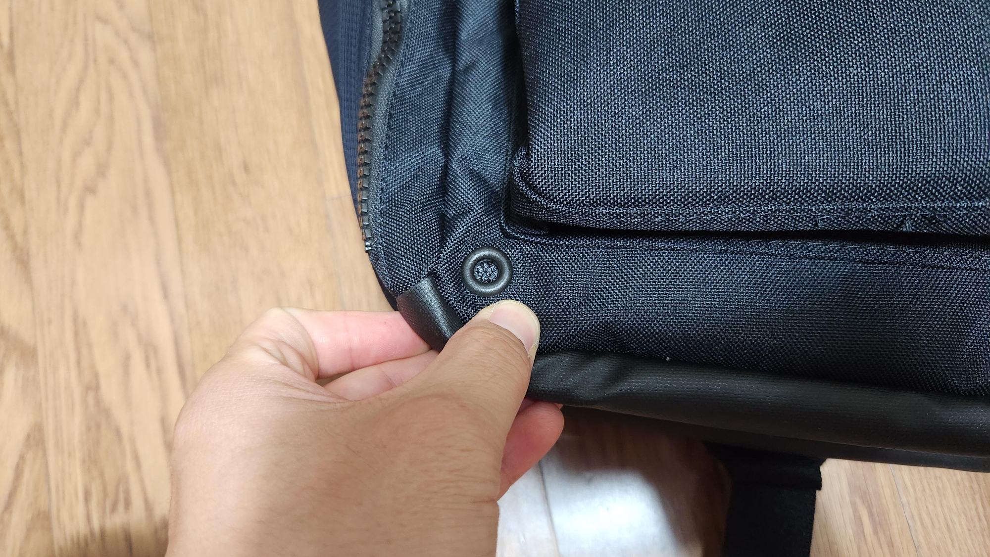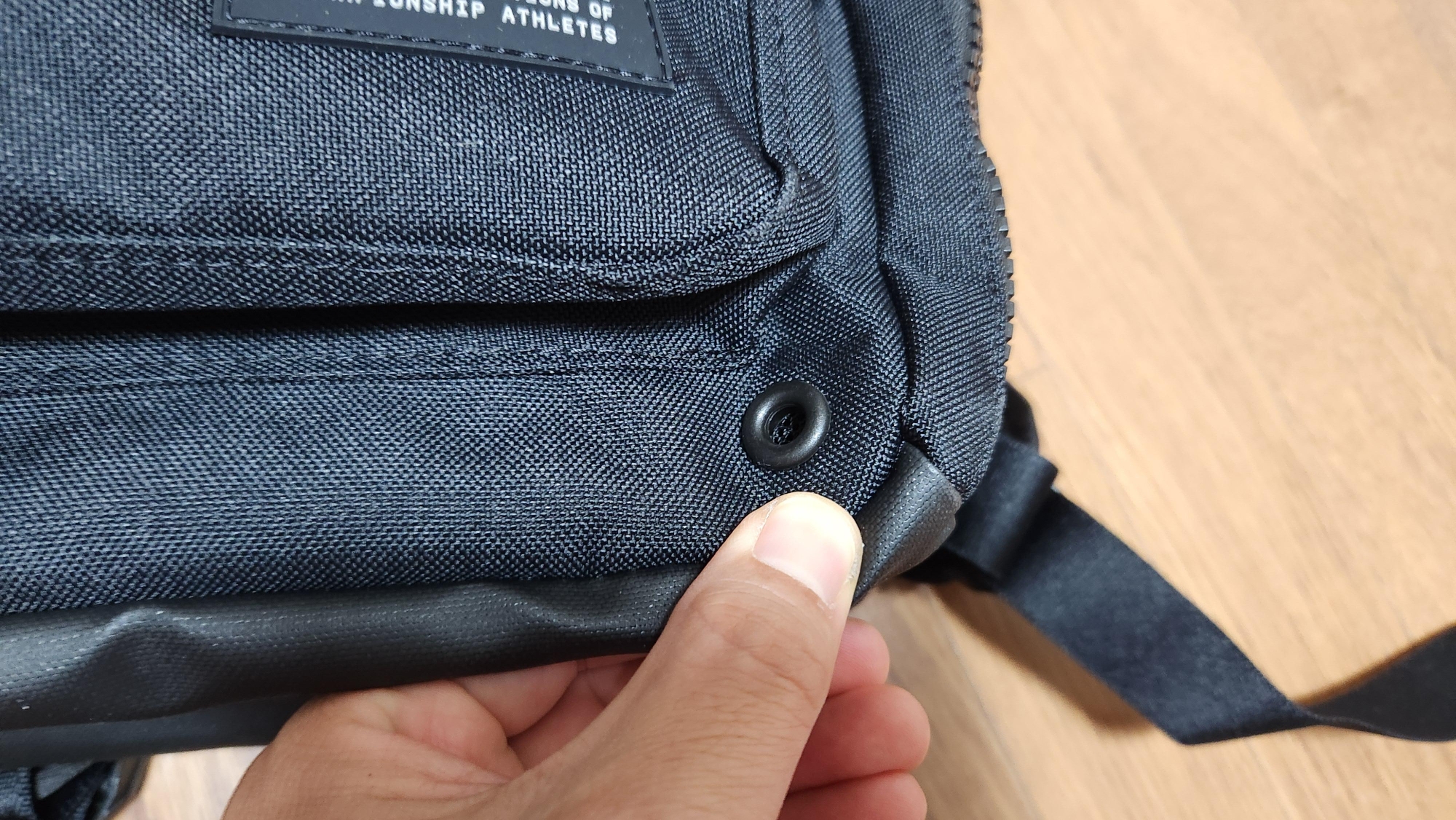 그리고 가방 하단에는 아래 사진과 같이 양쪽에 두개의 구멍이 있는데요. 공기도 순환이 가능할 것 같고, 가방 안쪽으로 들어간 물을 쉽게 빼 낼 수 있을 것 같습니다.