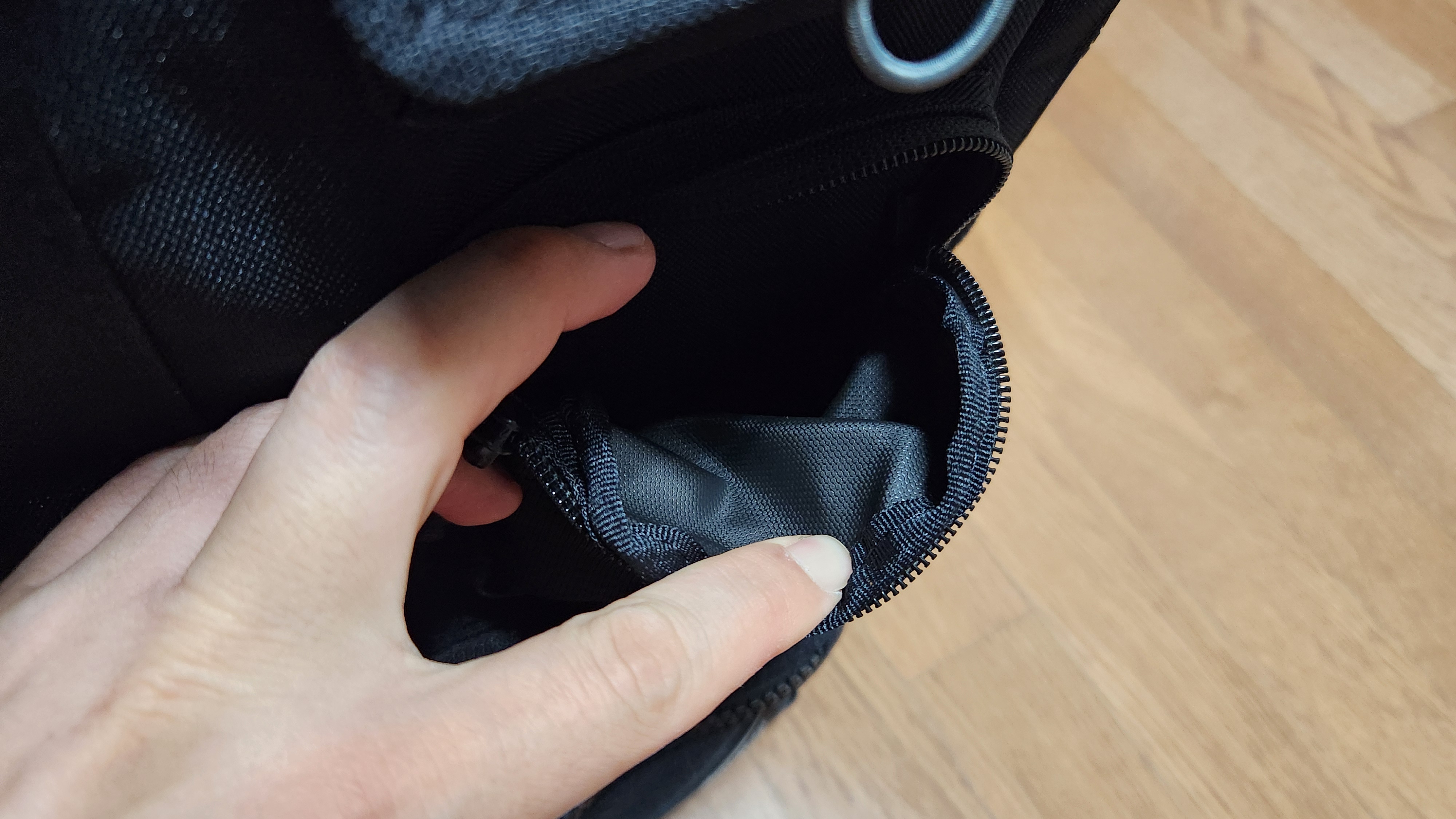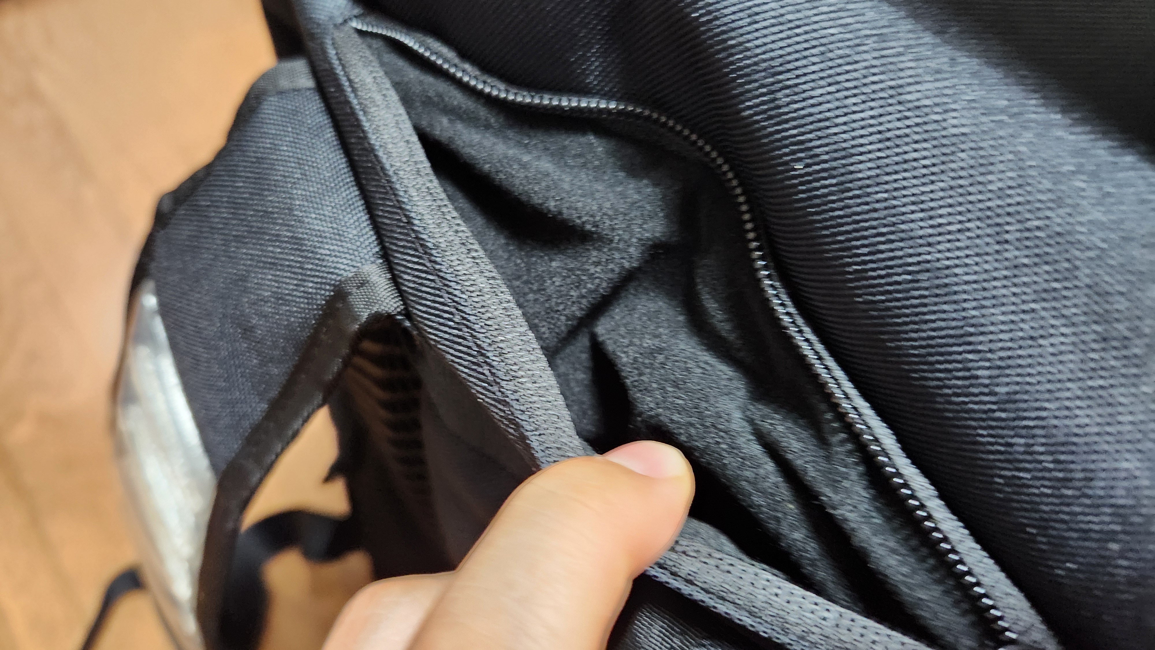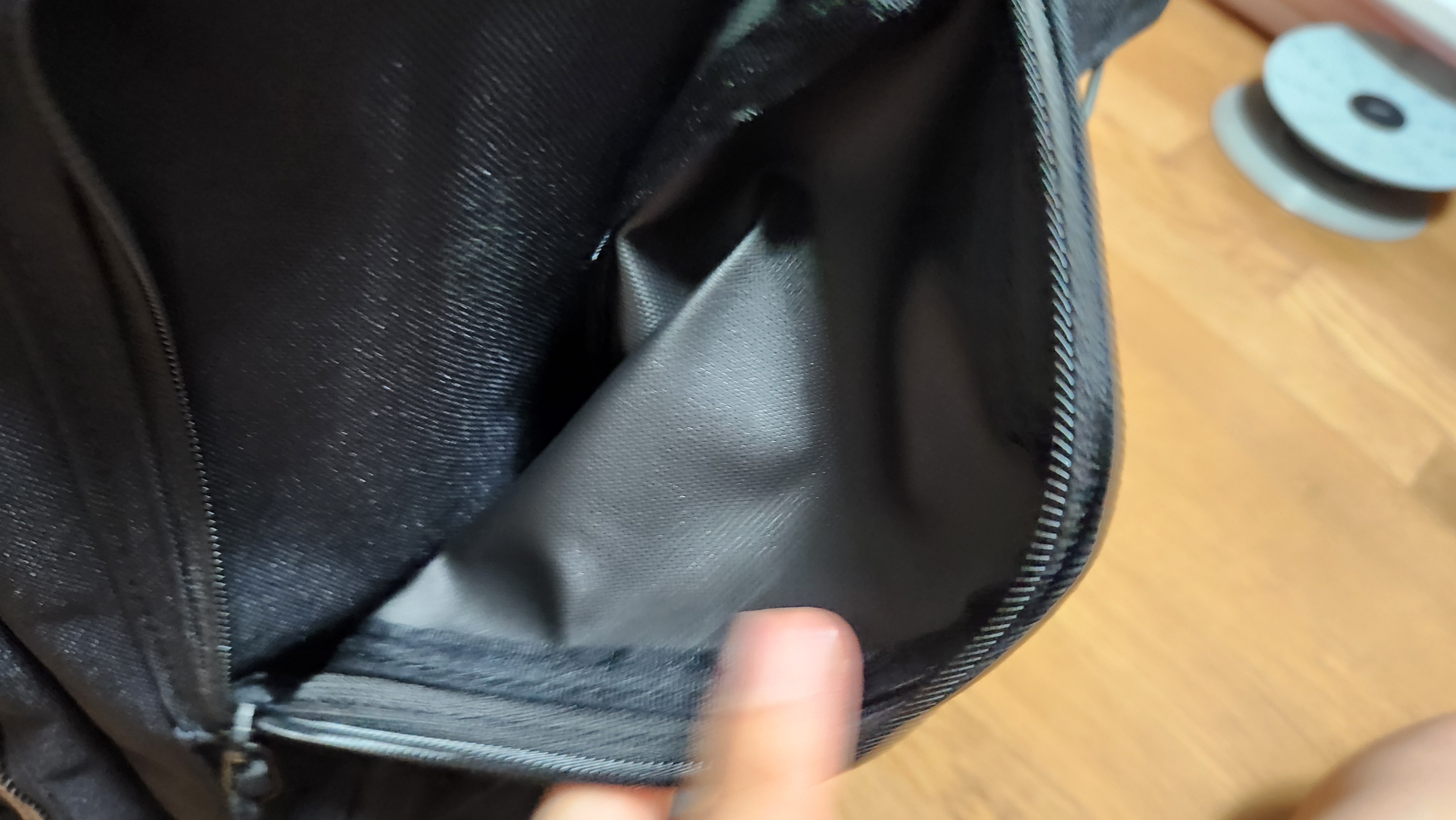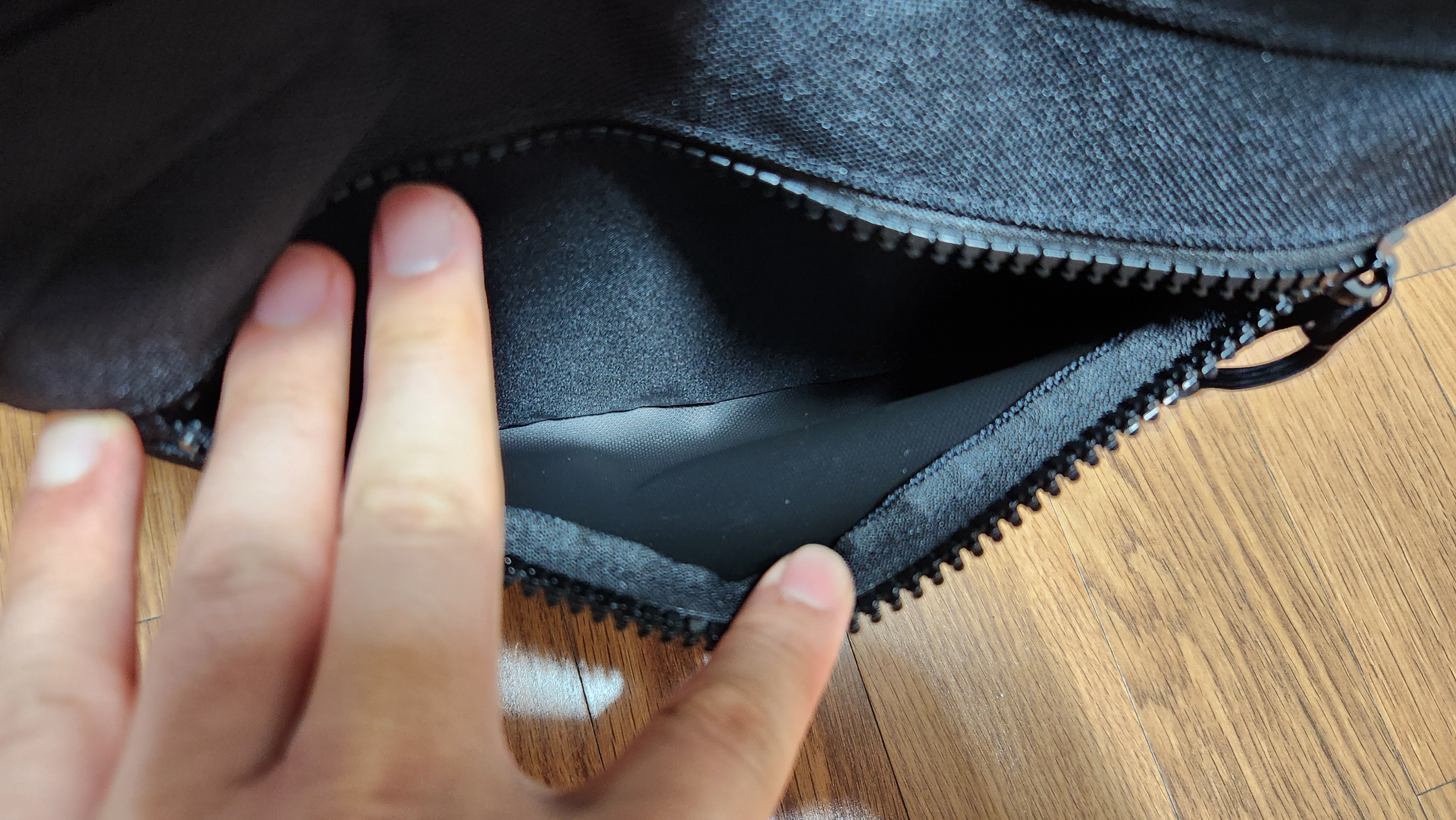 이중 지퍼 중 앞쪽에는 커다란 지퍼로 손쉽게 열리는 주머니가 있고 역시나 여기도 바깥에는 방수처리가 되어 있습니다.