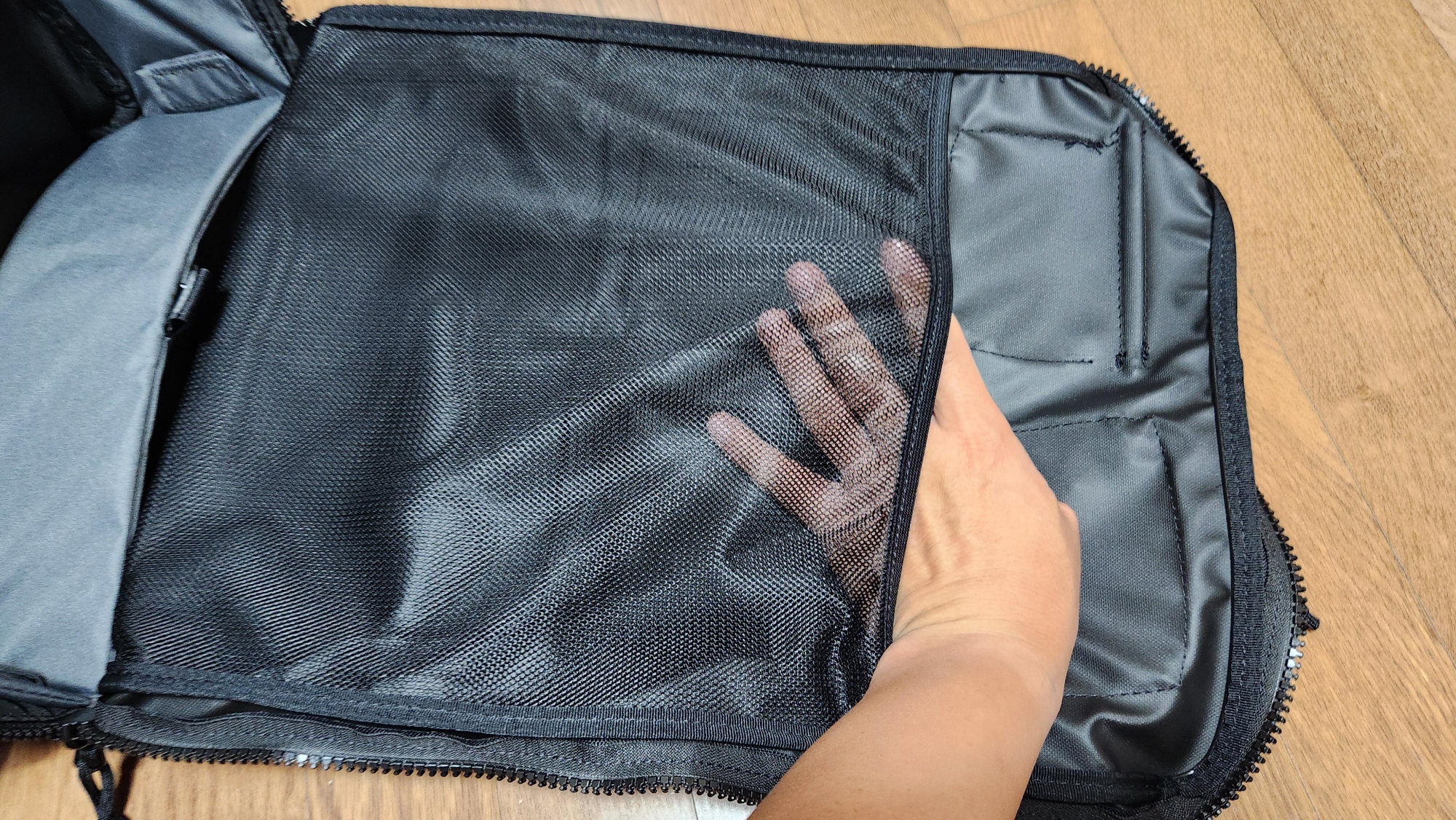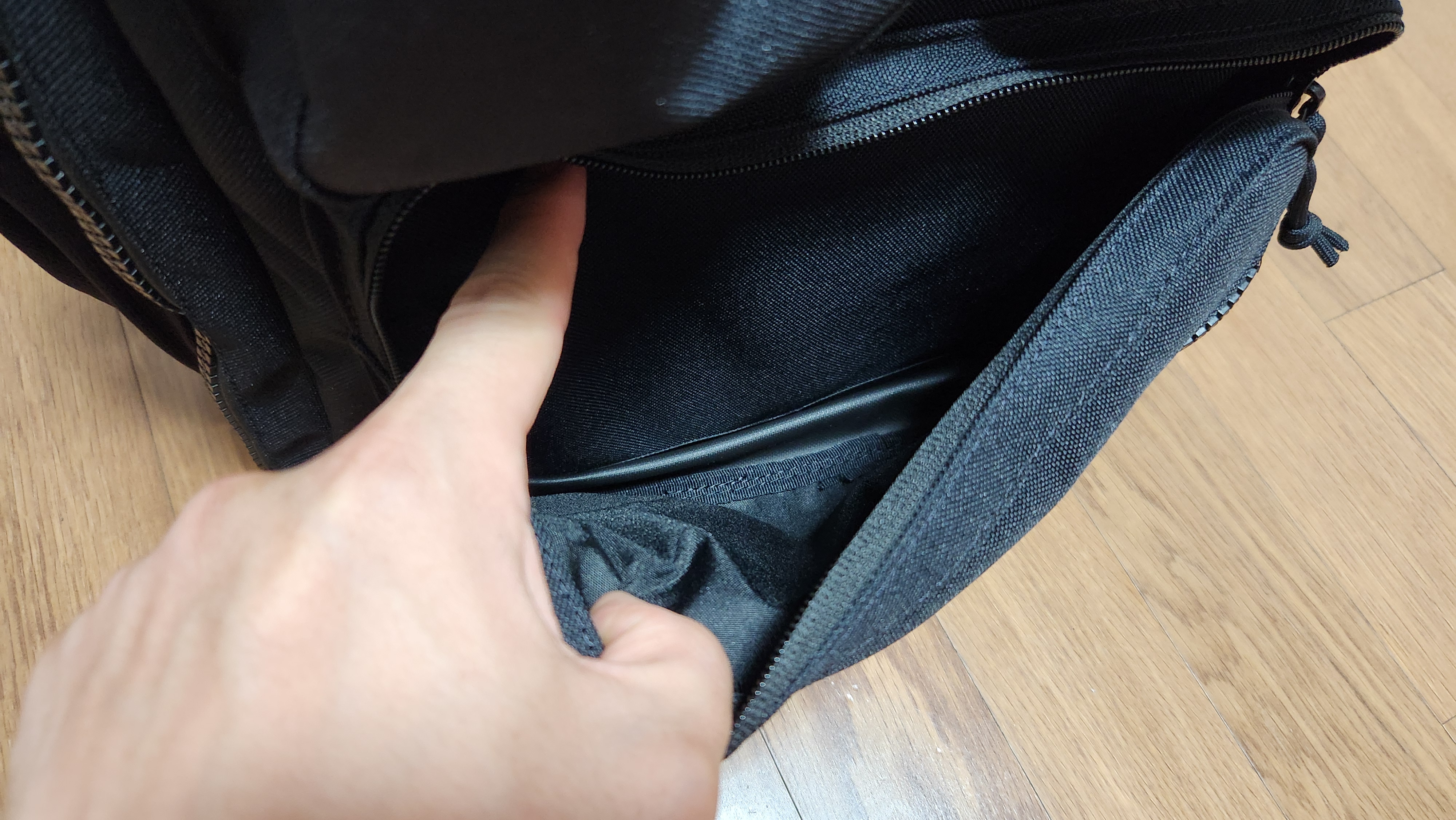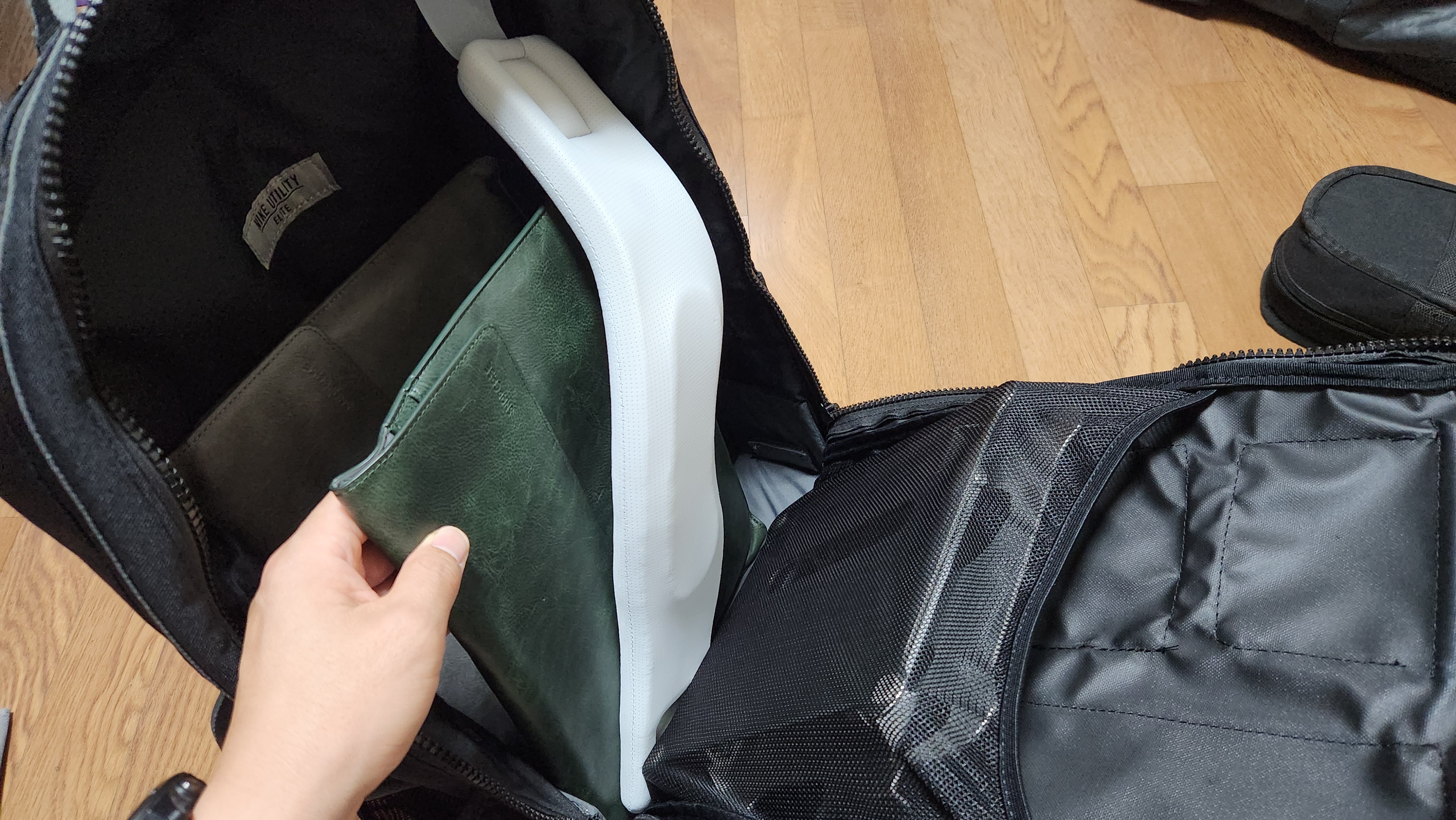 가방의 앞쪽 커버에 있는 메쉬 주머니에는 아래와 같이 노트북 스탠드를 접어서 넣어두었습니다.