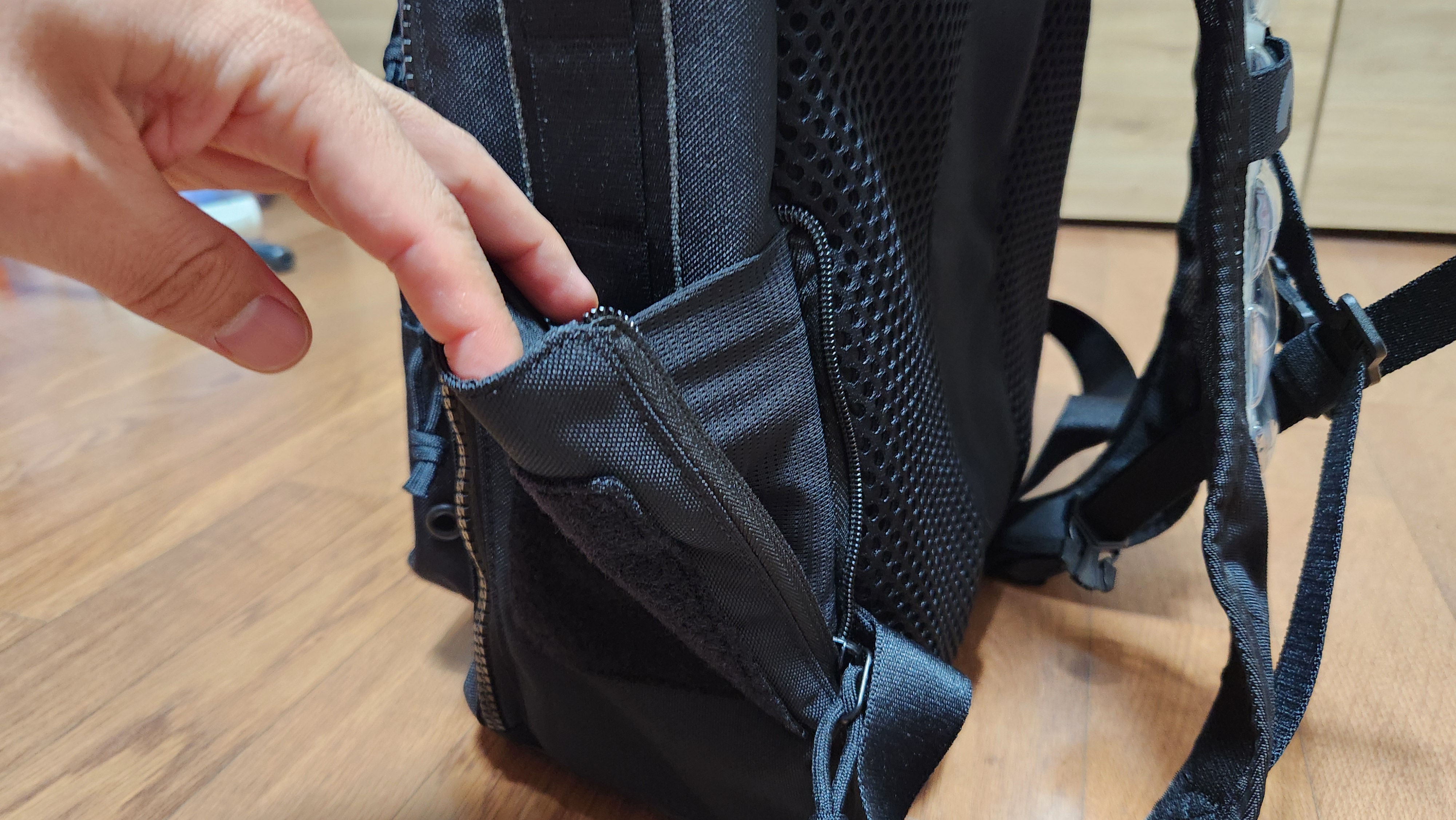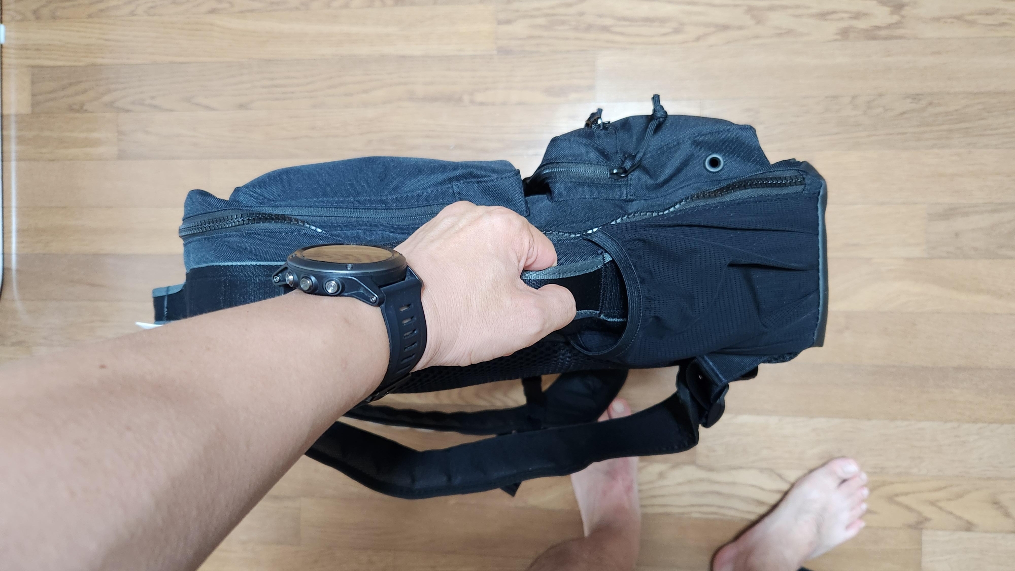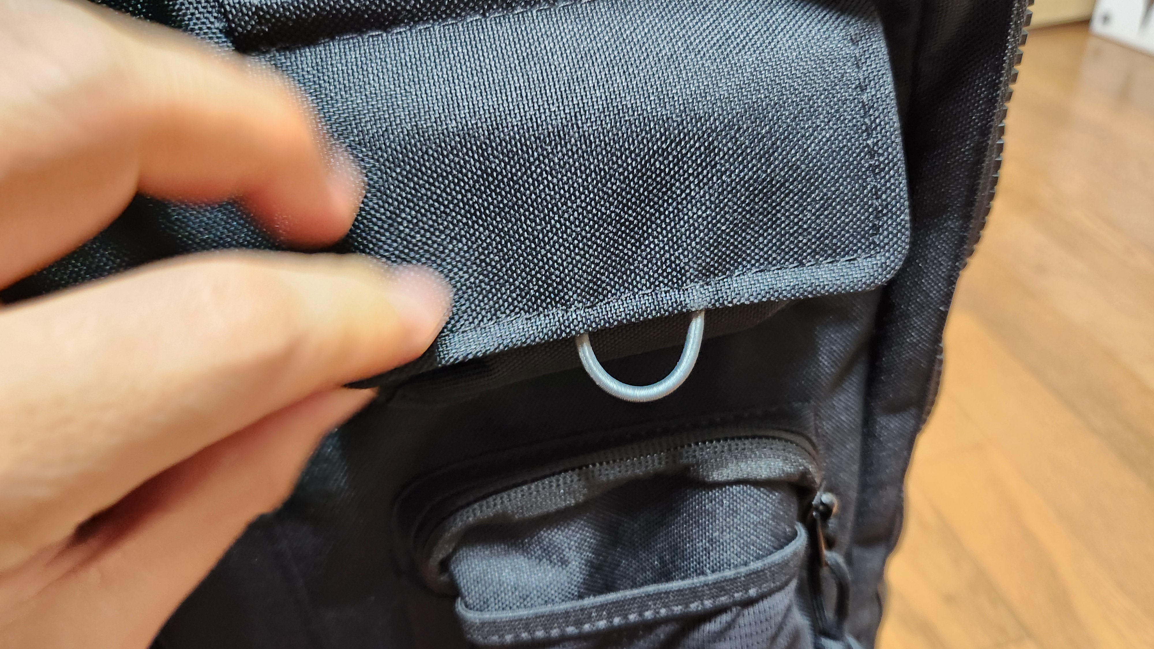 정면 상단에 있는 주머니는 지퍼로 되어 있지 않고 벨크로로 처리가 되어 있어서 신속하게 물건을 꺼내어 쓸 수 있는 수납 공간이 있고요. 바깥 쪽에도 오링처럼 잡을 수 있게 되어 있습니다.