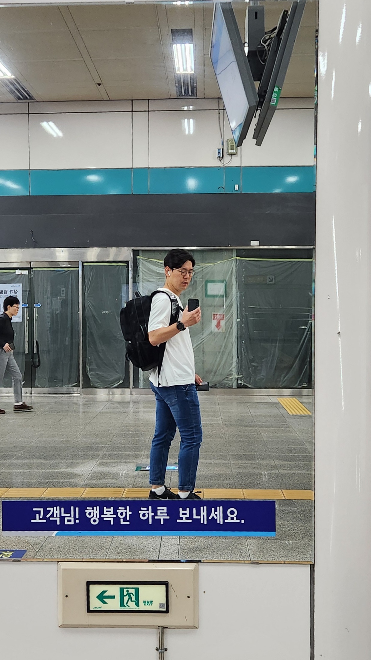 지하철에서도 한 컷 남겨 봅니다. 착용해보면 상당히 큰 느낌이 있는 가방인데요. 그래도 사진을 찍어보면 그렇게 커보이지는 않네요.