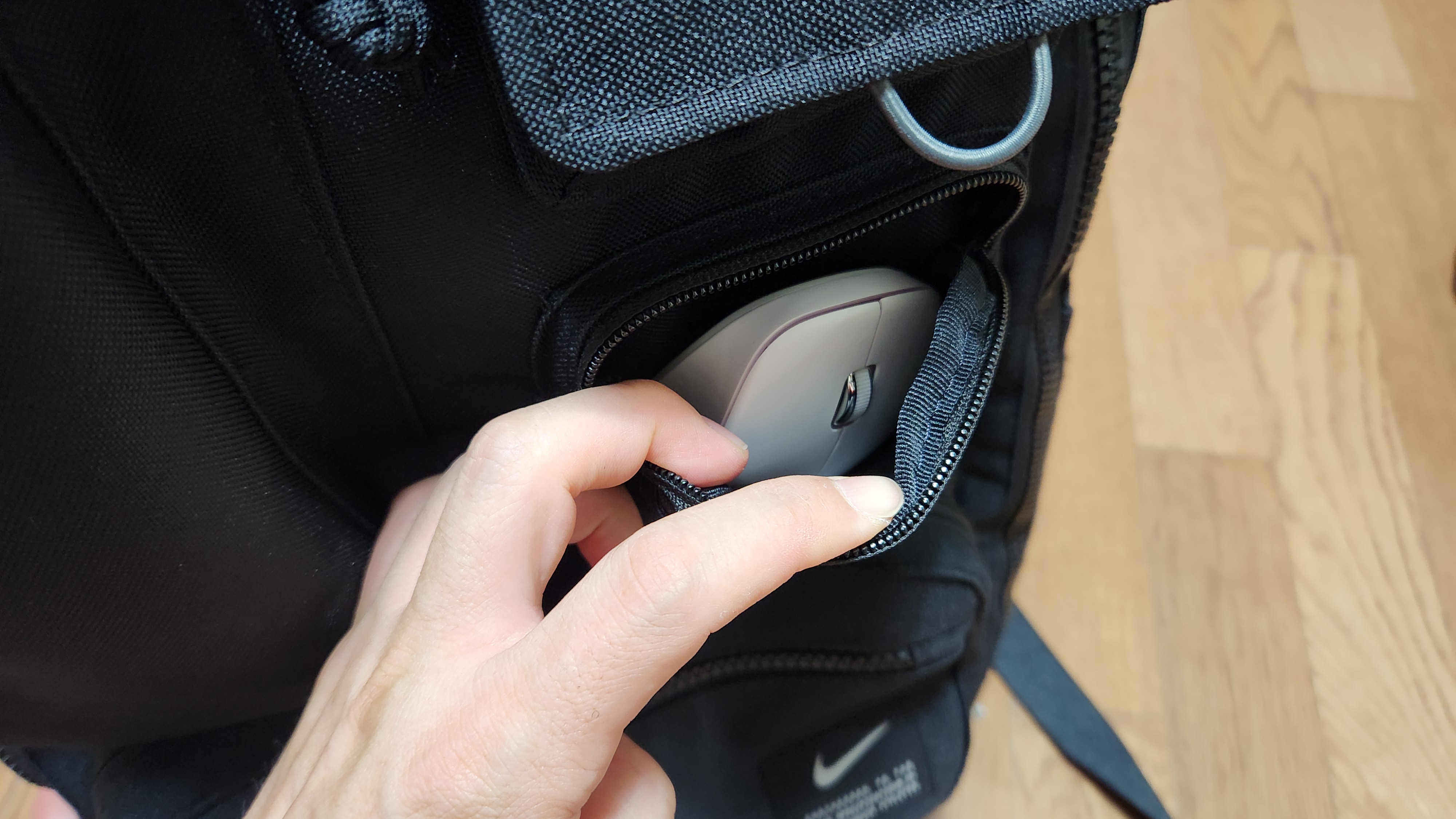 그리고 우측의 조금 작은 주머니에는 아래와 같이 블루투스 마우스를 넣어두고 사용하고 있습니다. 주머니가 밖에 있기 때문에 쉽게 꺼내고 사용할 수 있어서 좋더군요.
