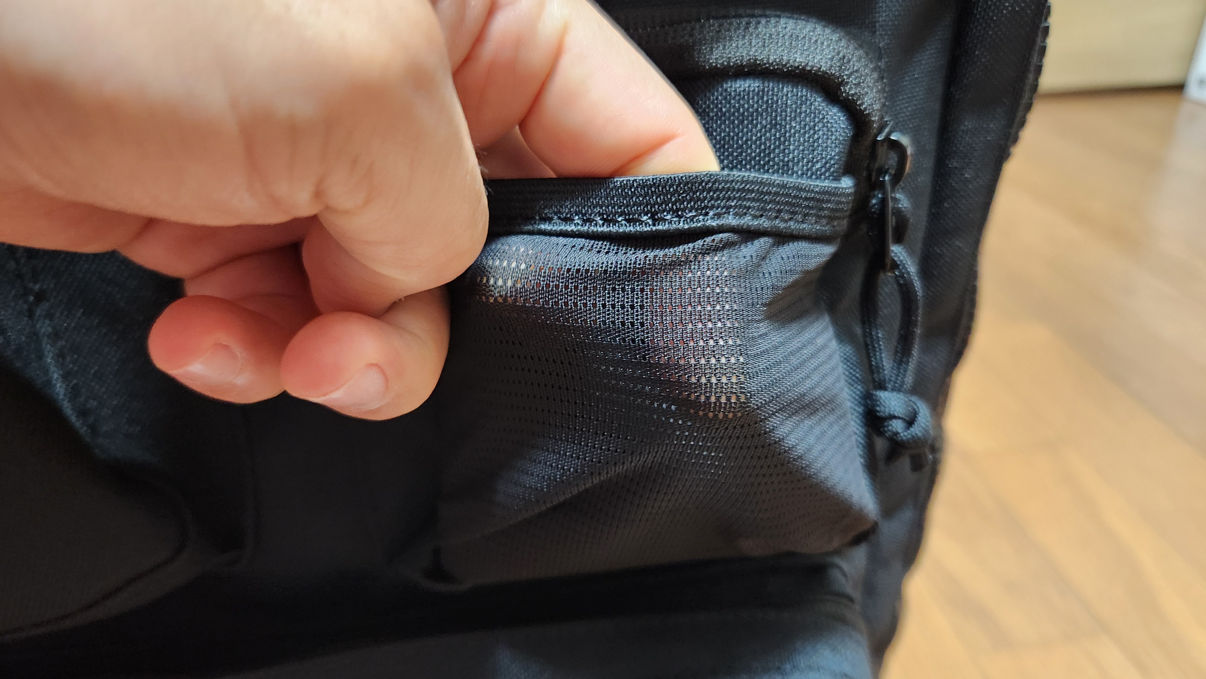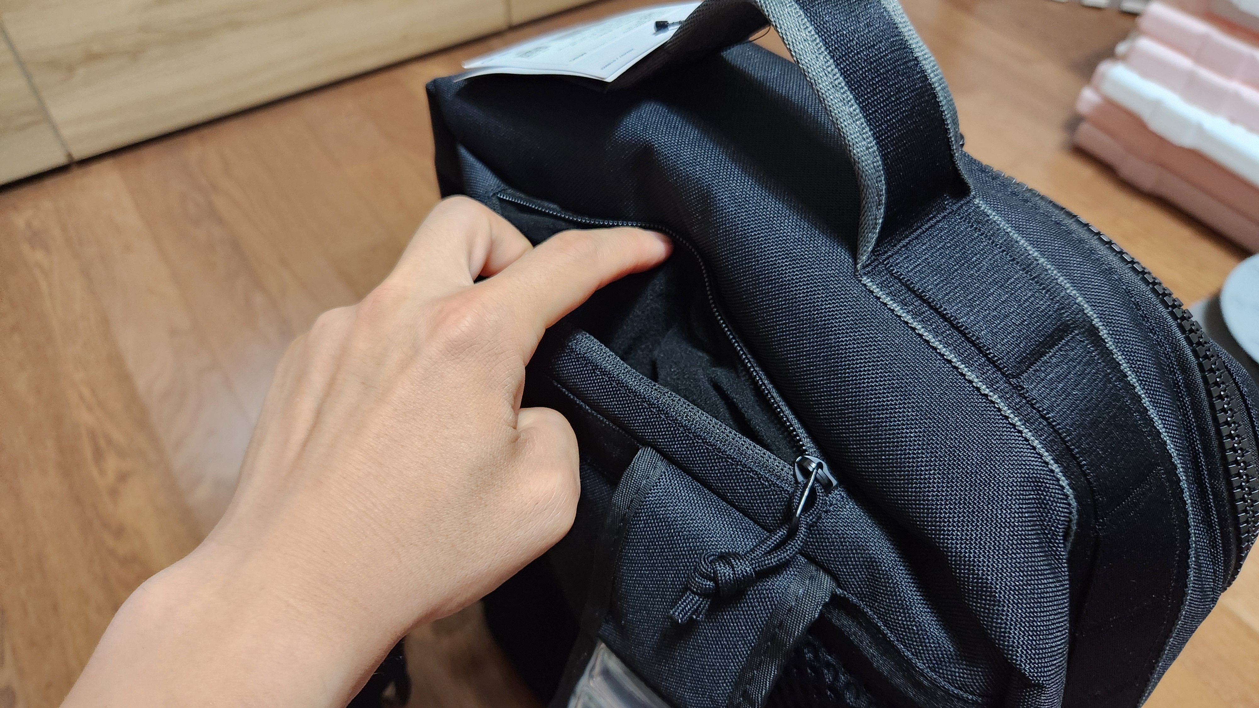 상단의 주머니는 위 지퍼보다 촘촘한 지퍼로 구성이 되어 있고요. 볼륨이 어느정도 되어서 꽤나 큰 물건들을 수납하기 좋도록 되어있습니다.