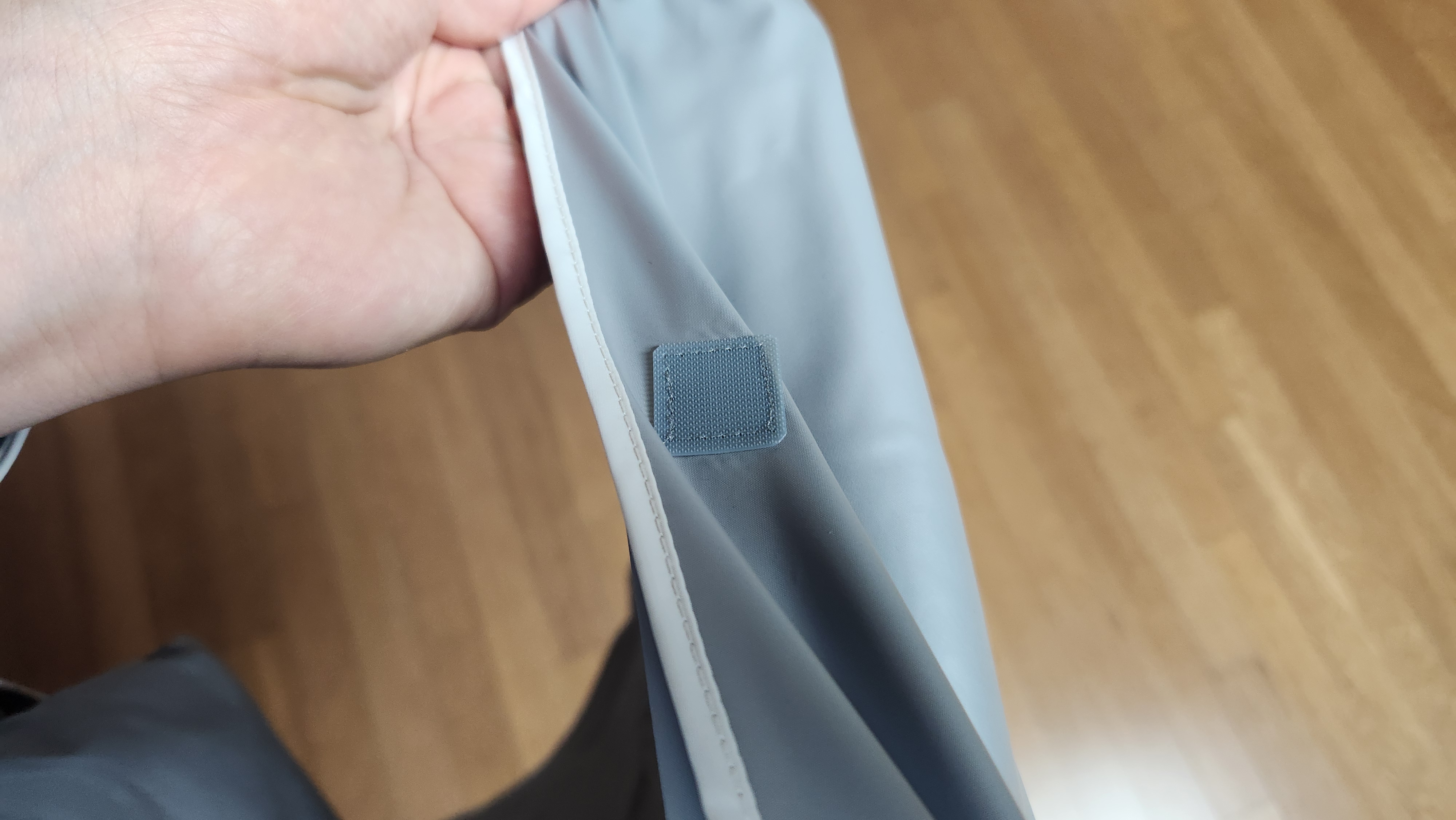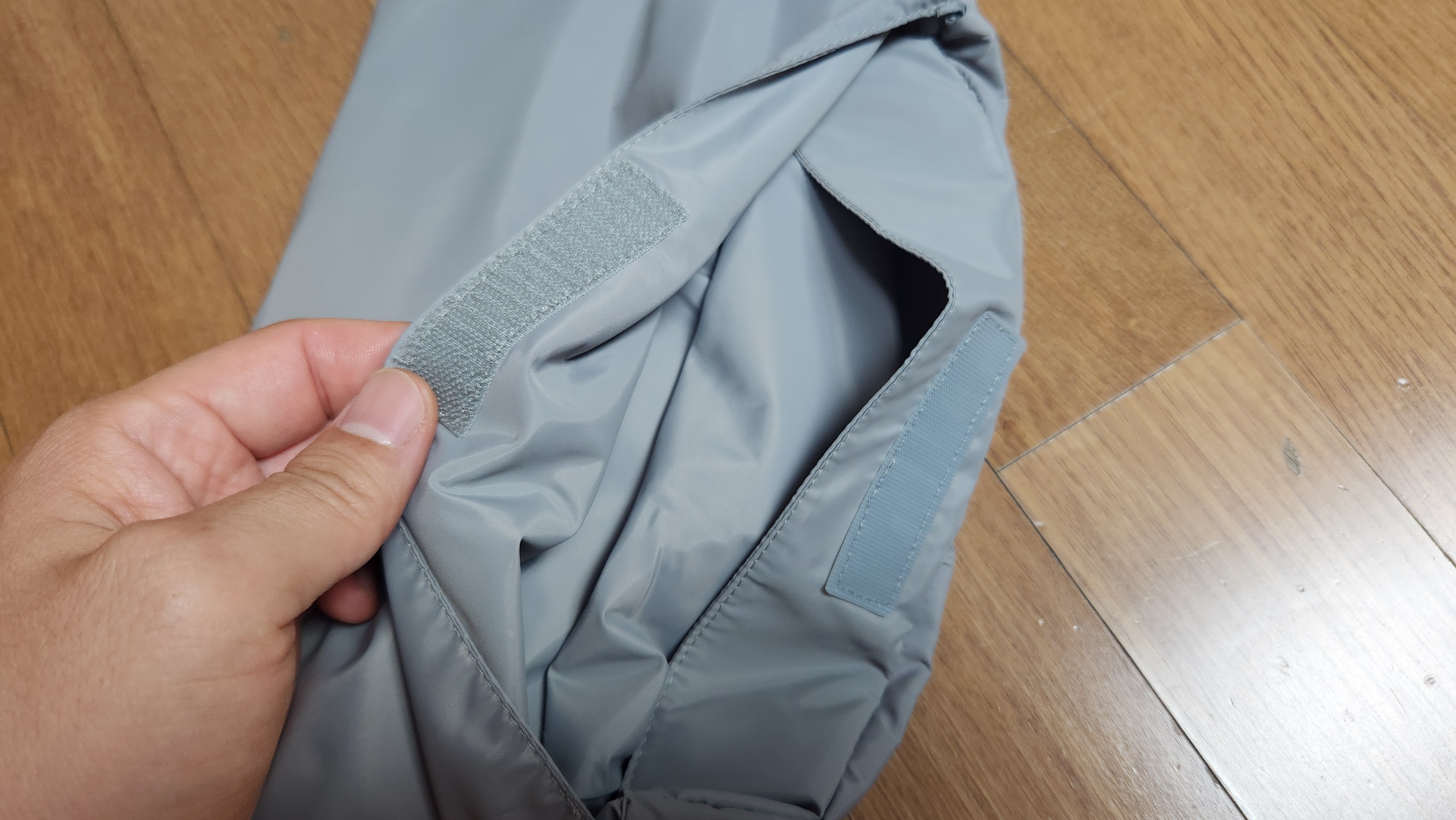 착용하고 난 후 팔 아래 쪽을 보시면 제봉된 부분이 있는데요. 벨크로가 부착되어 있습니다. 팔을 넣고 난 후 벨크로를 부착하면 팔을 파닥 파닥 움직여도 잘 잡아줍니다.