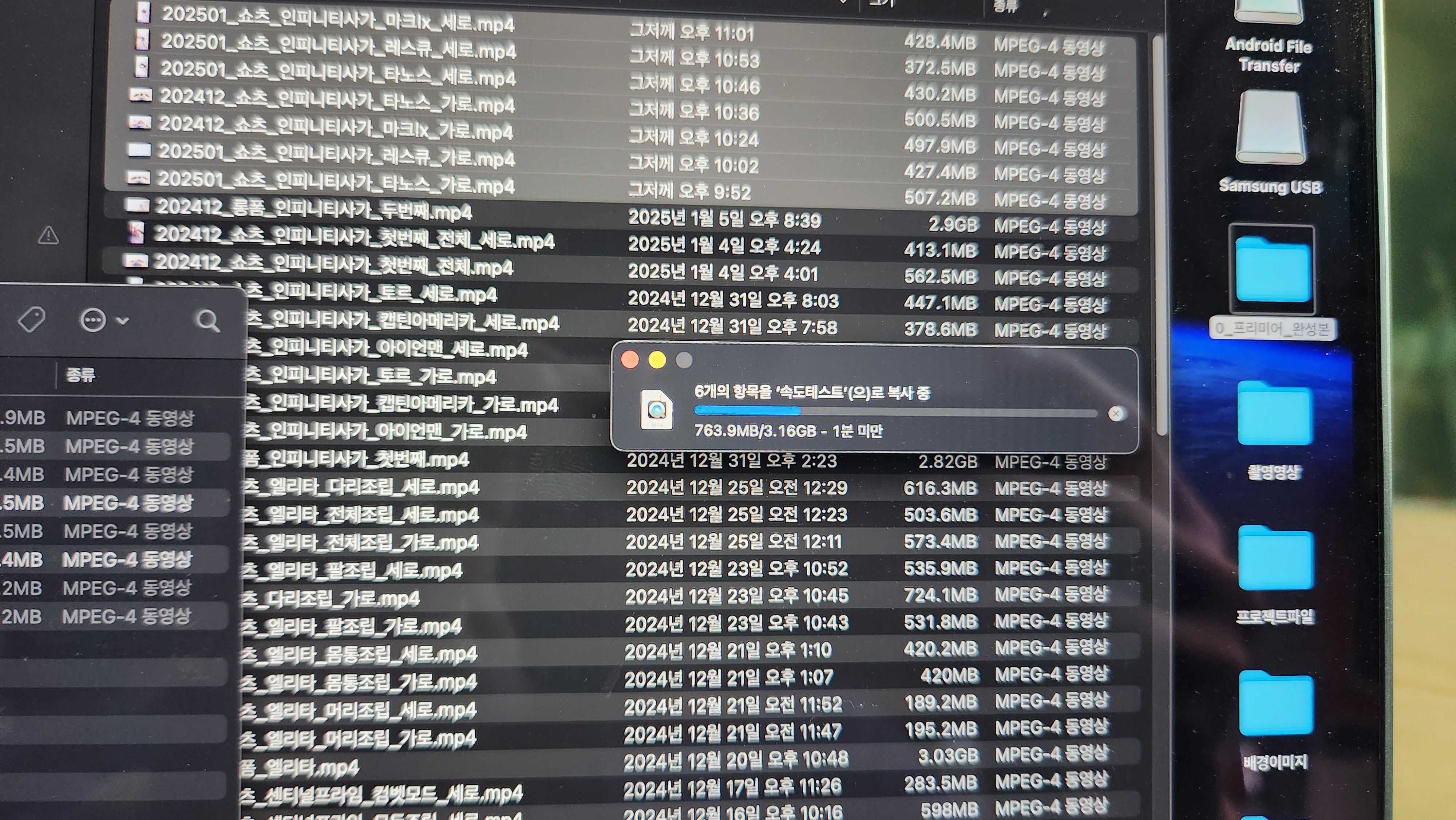 이제 쓰기 속도를 체크해봅니다. 기존에 만들어둔 유튜브 쇼츠 영상을 업로드 하기 위해 쇼츠영 상 여러개를 삼성 플래쉬.메모리 드라이브로 옮겨봅니다. 약 3GB 용량의 쇼츠 영상을 옮기는데 1분 정도 소요된다고 표시됩니다.