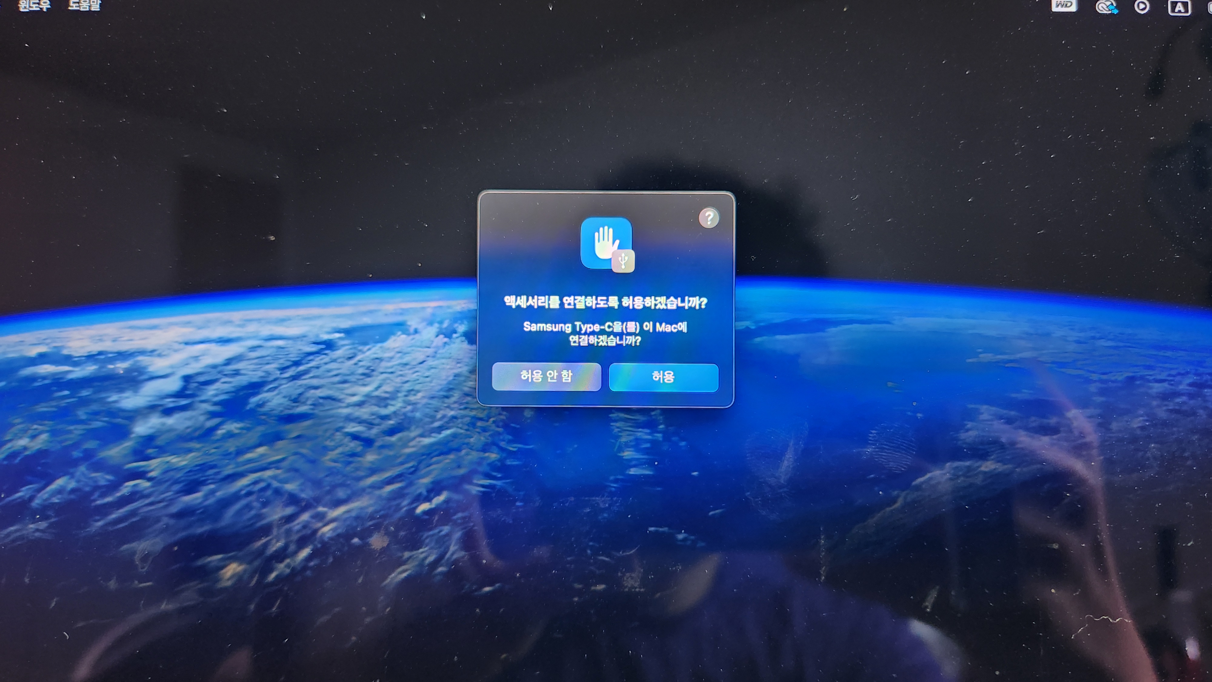 그럼 M3 맥북프로에서 아래와 깉이 "액세사리를 연결하도록 허용 하시겠습니까?"라는 메세지가 나타납니다.
