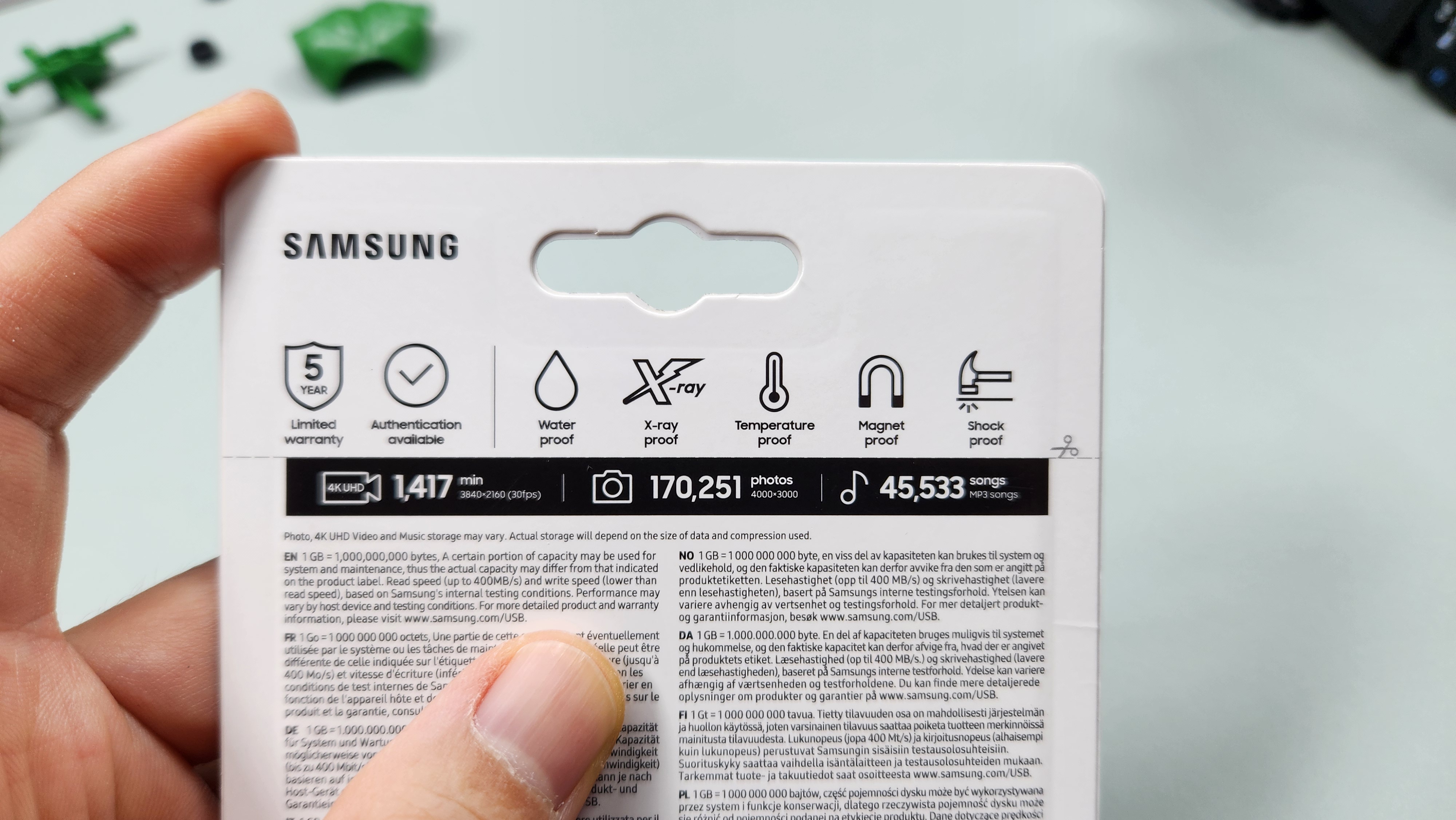포장에 포함된 설명을 살펴 보면요, 5년 동안 품질 보장이 됩니다. 물론 데이터 보장은 아니겠지만요. 그만큼 품질에 자신이 있다는 것이겠죠? 방수와 엑스레이 온도 자석 및 충격에 강하다고 나와 있습니다.