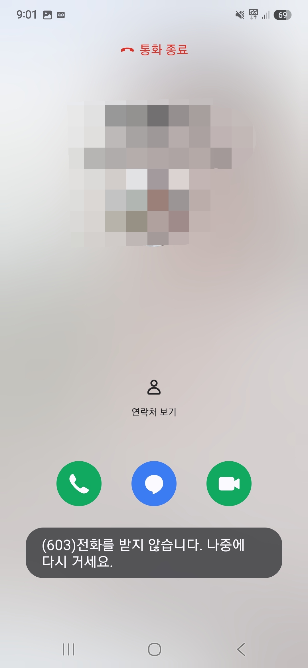 기기의 상태를 알아보기 위해 전화는 잘되는지 옆에 있는 와이프에게 전화를 걸어봤는데요. 아래와 같이 핸드폰이 발신이 안된다는 안내음성이 나오고, "603 전화를 받지 않습니다" 라는 에러 메세지가 나오는 상태였죠.