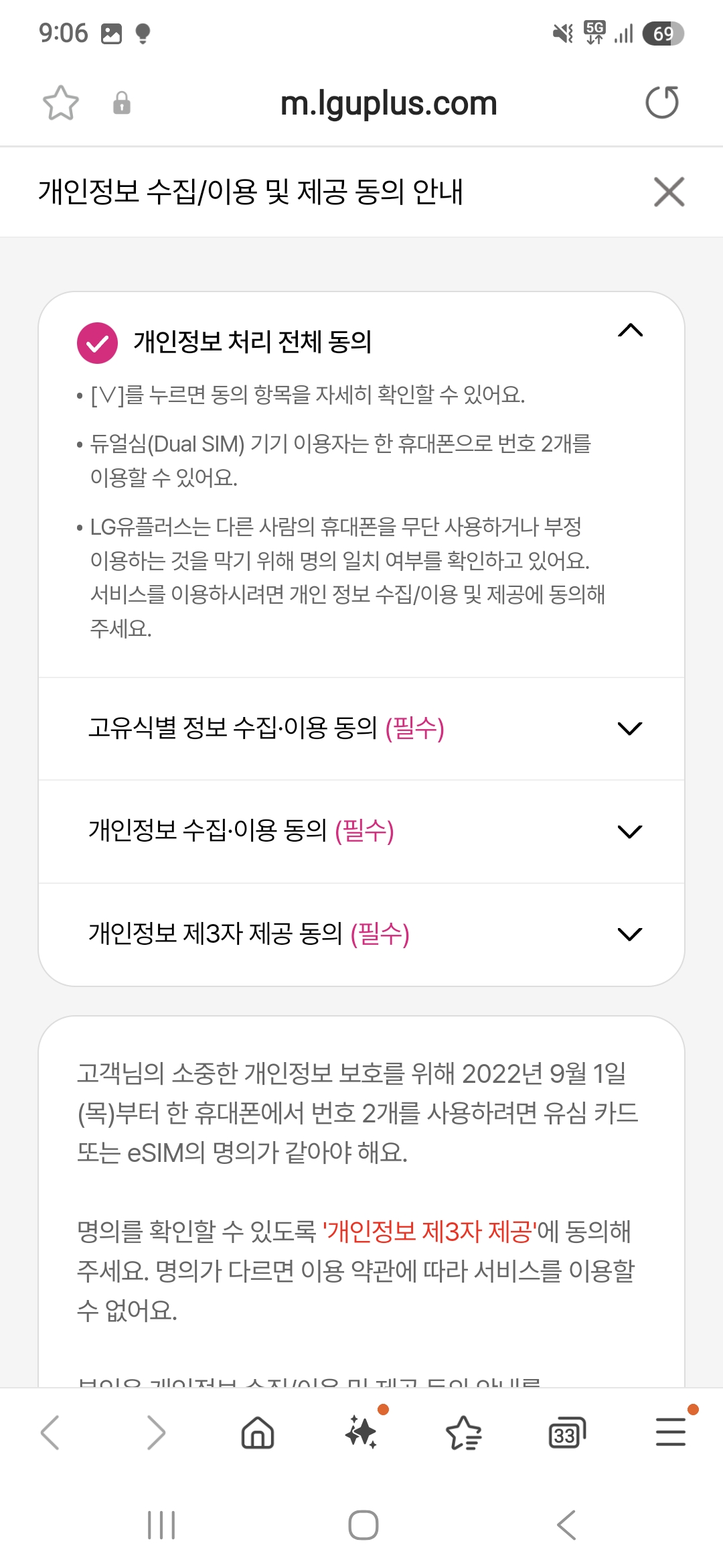 그럼 아래 페이지가 나오는데요. 최근 두개의 번호를 사용하는 듀얼심 기기들이 나오기 시작하면서 "2022년 9월 1일 부터 2개의 SIM 사용자 명의를 확인하기 위해 개인정보 3자 동의를 진행"해야한다고 설명되어 있습니다.