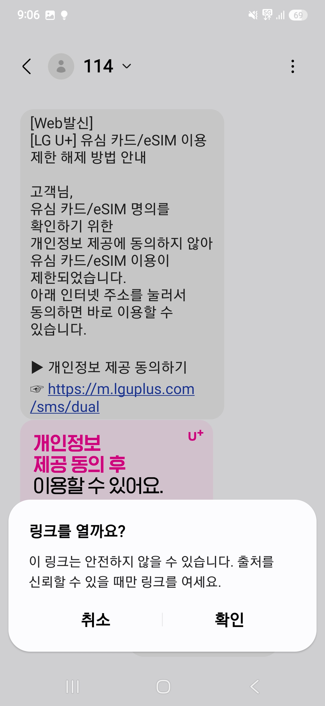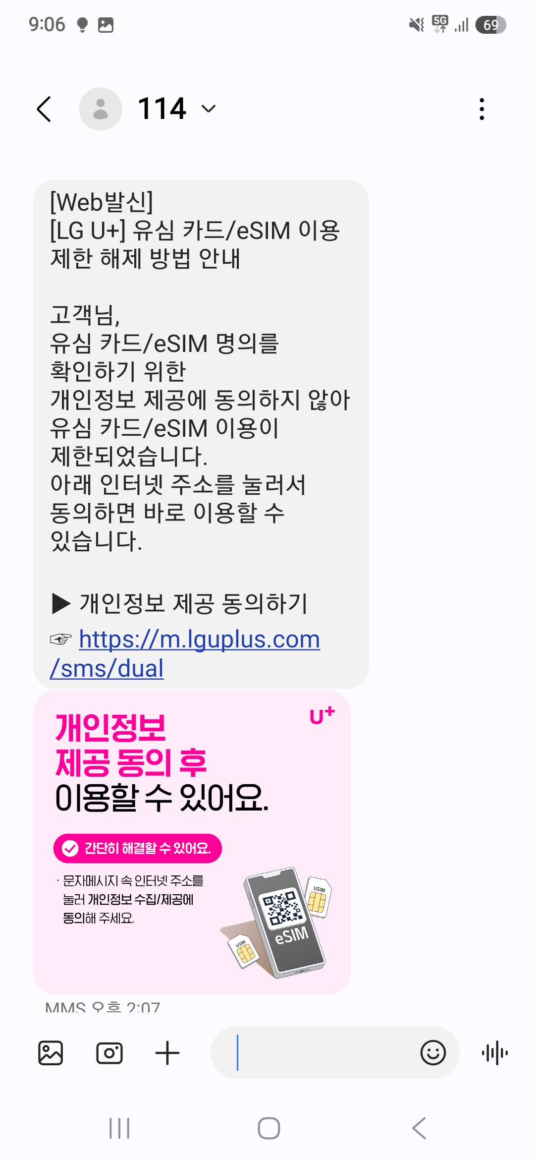위 내용을 살펴보면, 유심카드 및 eSIM카드 명의를 확인하기 위한 개인정보 제공에 동의하지 않았기 때문에 유심 및 eSIM 이용이 제한되었다는 문자가 와 있었습니다.