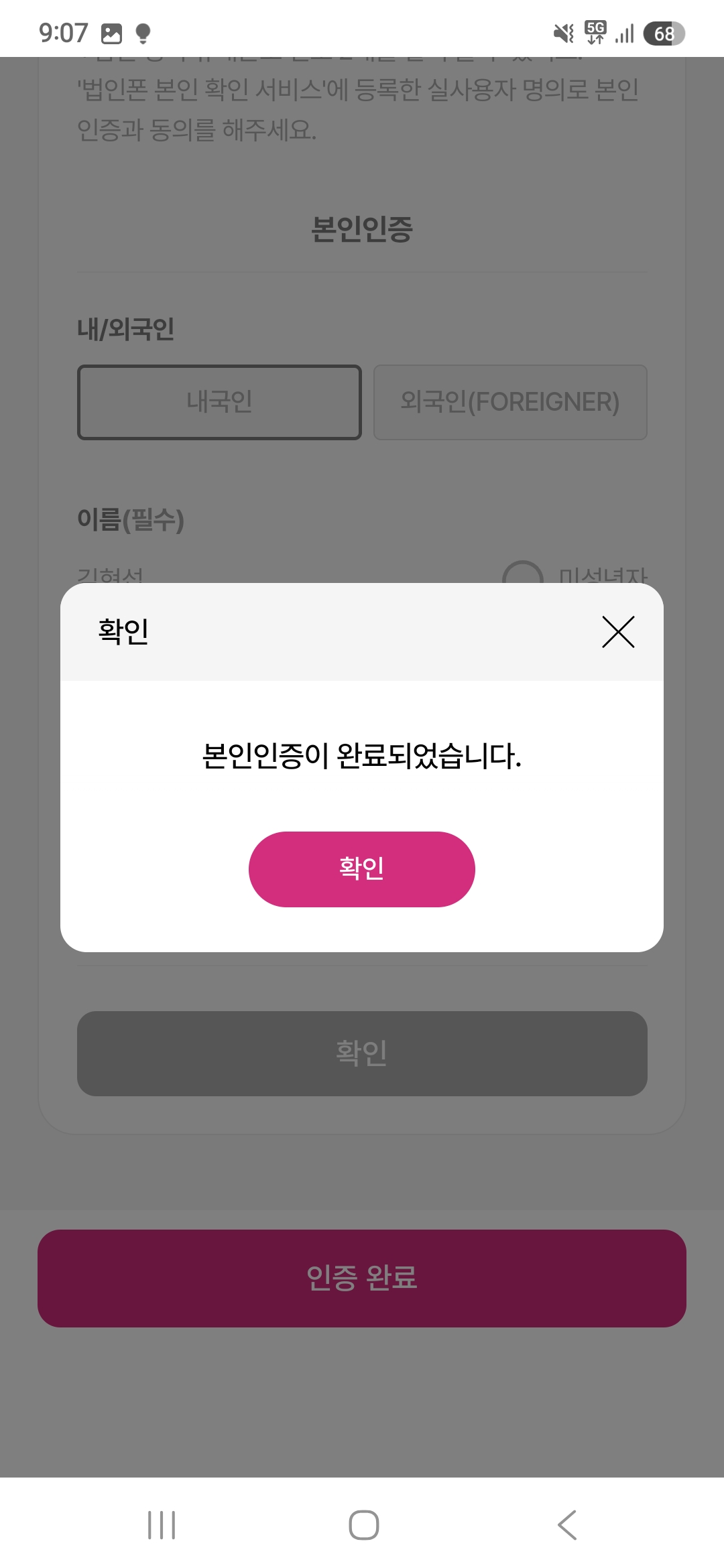 위 인증 절차를 정상적으로 완료하게 되면, 아래와 같이 "본인인증이 완료되었습니다"라는 메세지를 확인 할 수 있습니다.