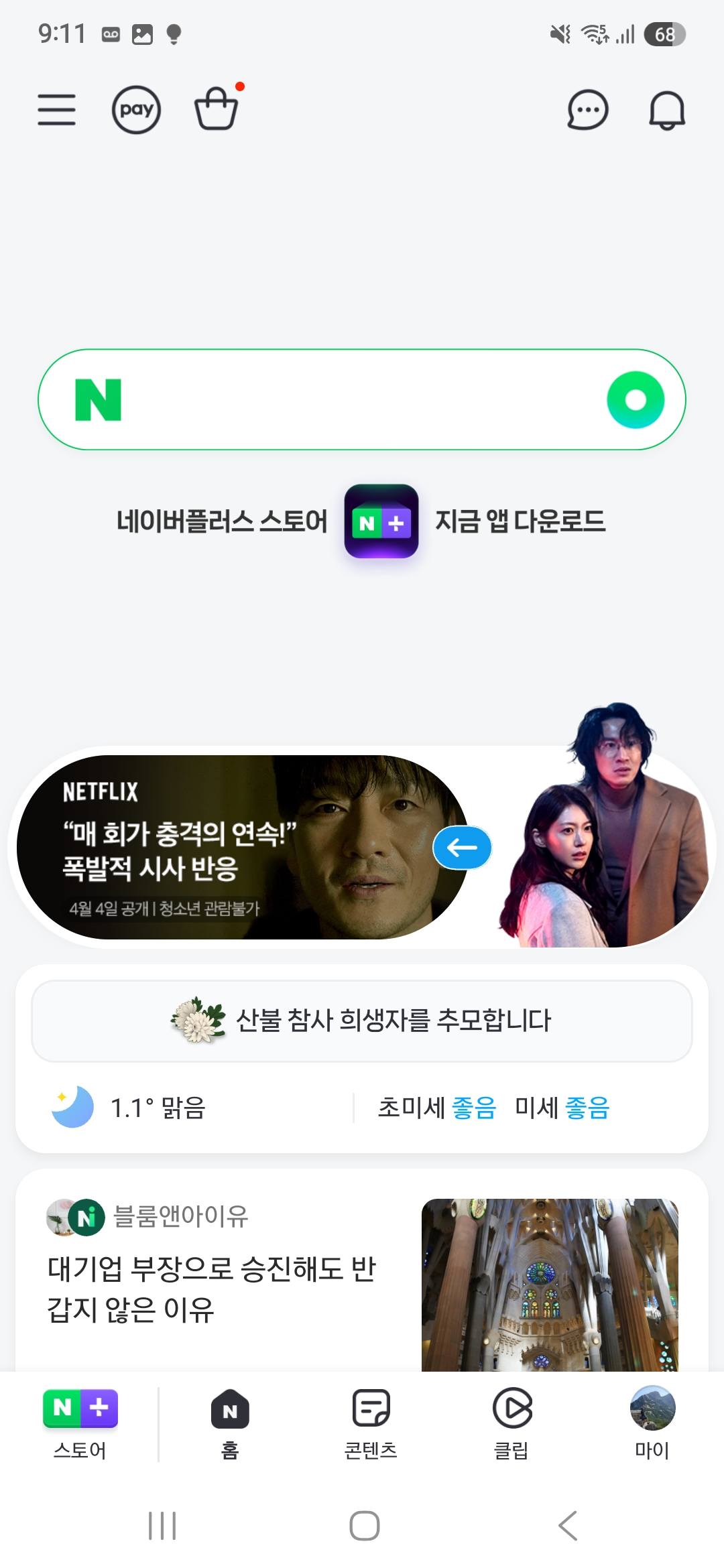 그럼 이제 모바일 데이터로 인터넷이 잘 되는지 확인해 봐야겠지요. 네이버 앱으로 네이버가 잘 뜨는지 확인해 봤습니다.