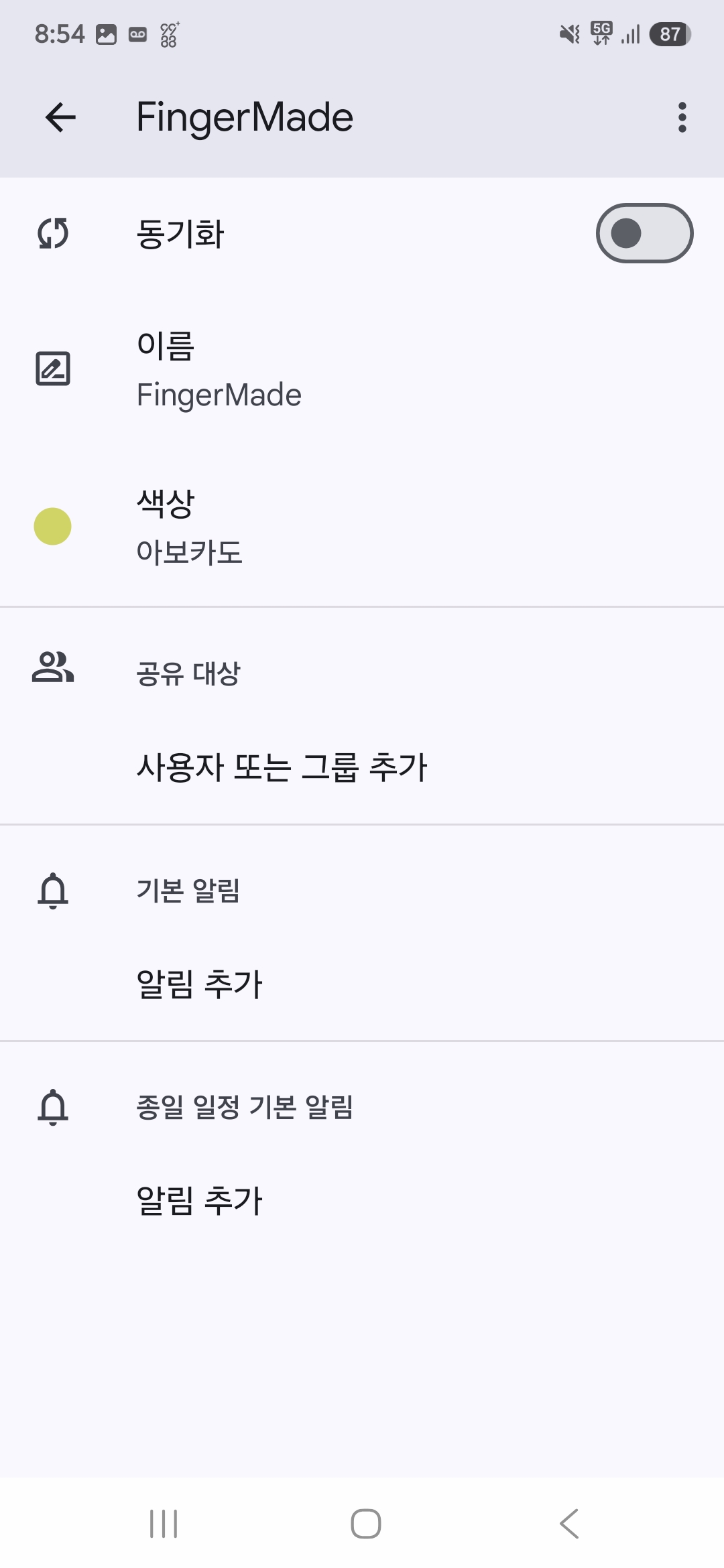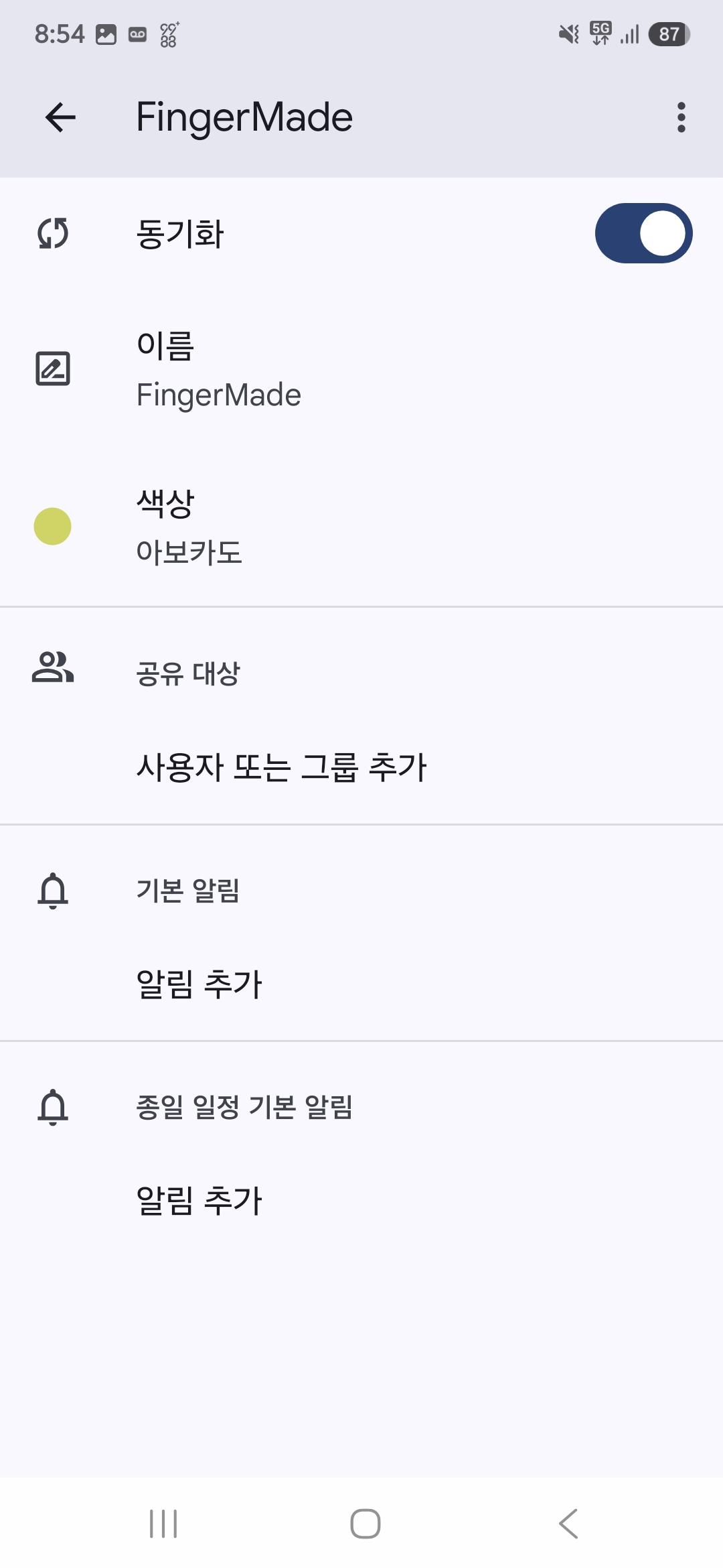 위 화면에서 "FingerMade"를 선택하게 되면 아래와 같이 해당 캘린더의 세부 내용들이 나타나는데요. 제일 상단에 있는 "동기화" 부분을 켜주면 됩니다.