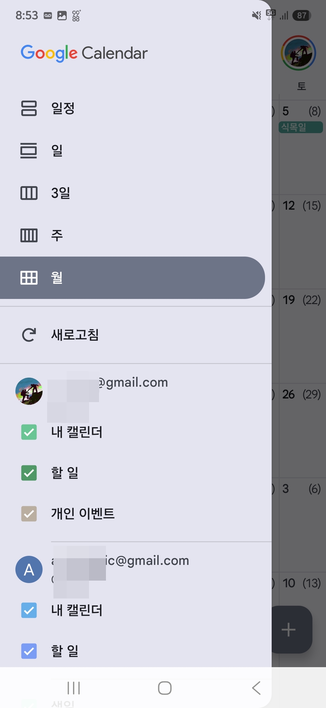 먼저 증상은 아래와 같이 구글 캘린더 어플리케이션으로 들어가면 메인 계정에 여러가지 캘린더가 있었는데, 지금은 내캘린더, 할 일, 개인 이벤트만 나오고 다른 캘린더가 나오지 않았습니다.