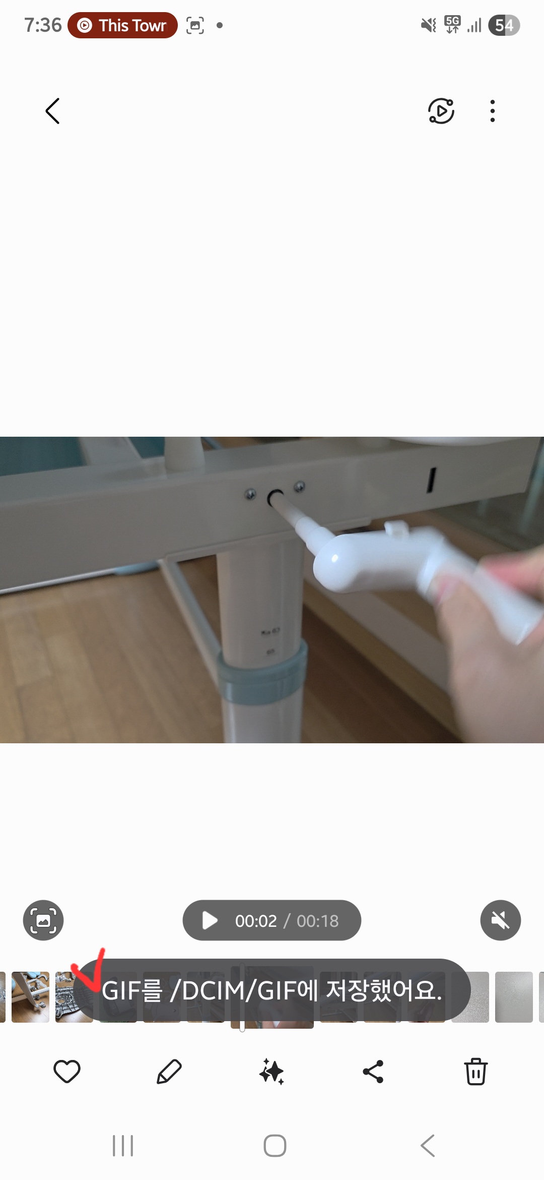 그 다음 상단에 있는 "저장" 버튼을 누르면 아래와 같이 동영상과 동일한 경로에 GIF로 저장되었다는 메세지를 확인 할 수 있습니다.