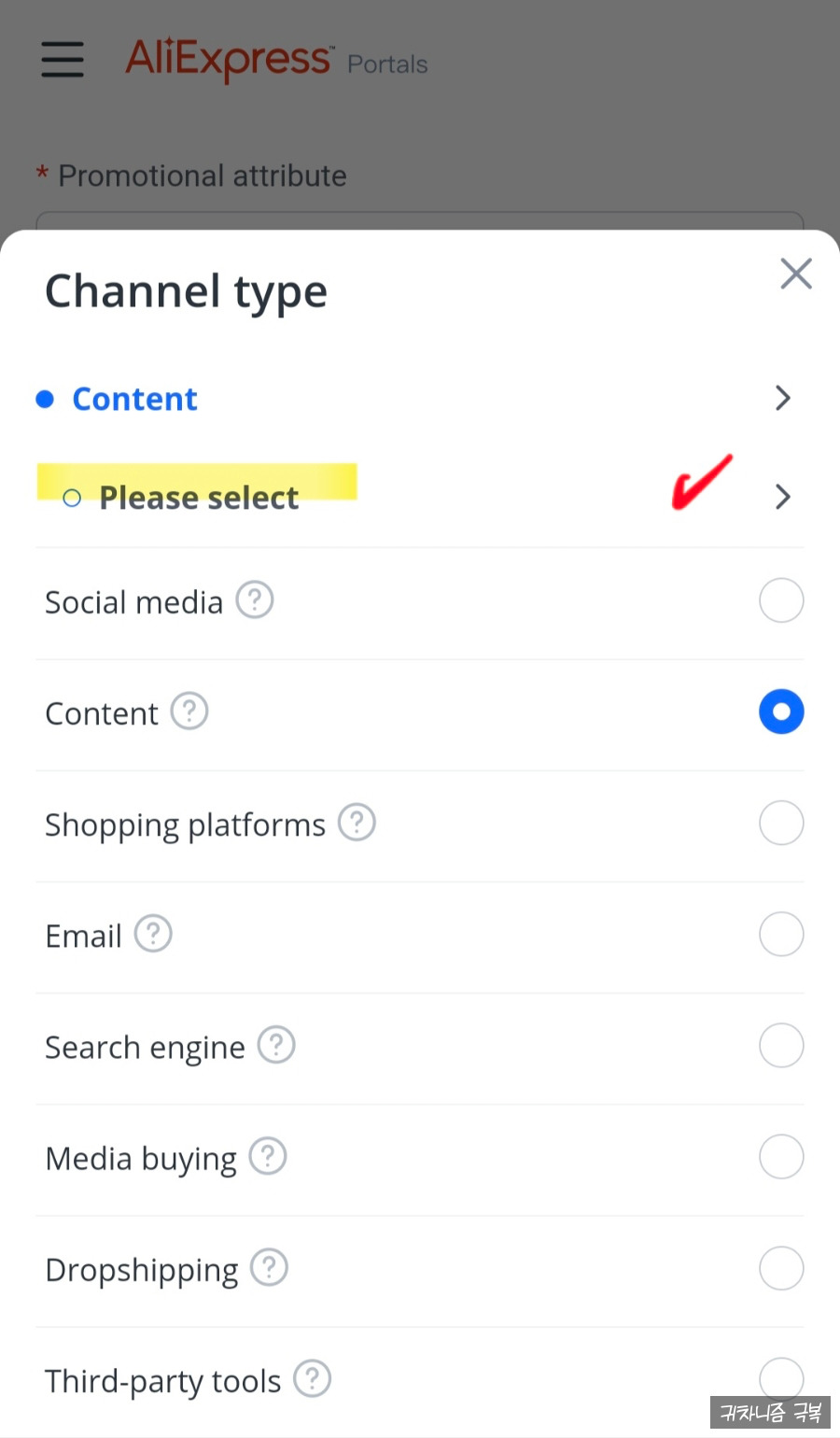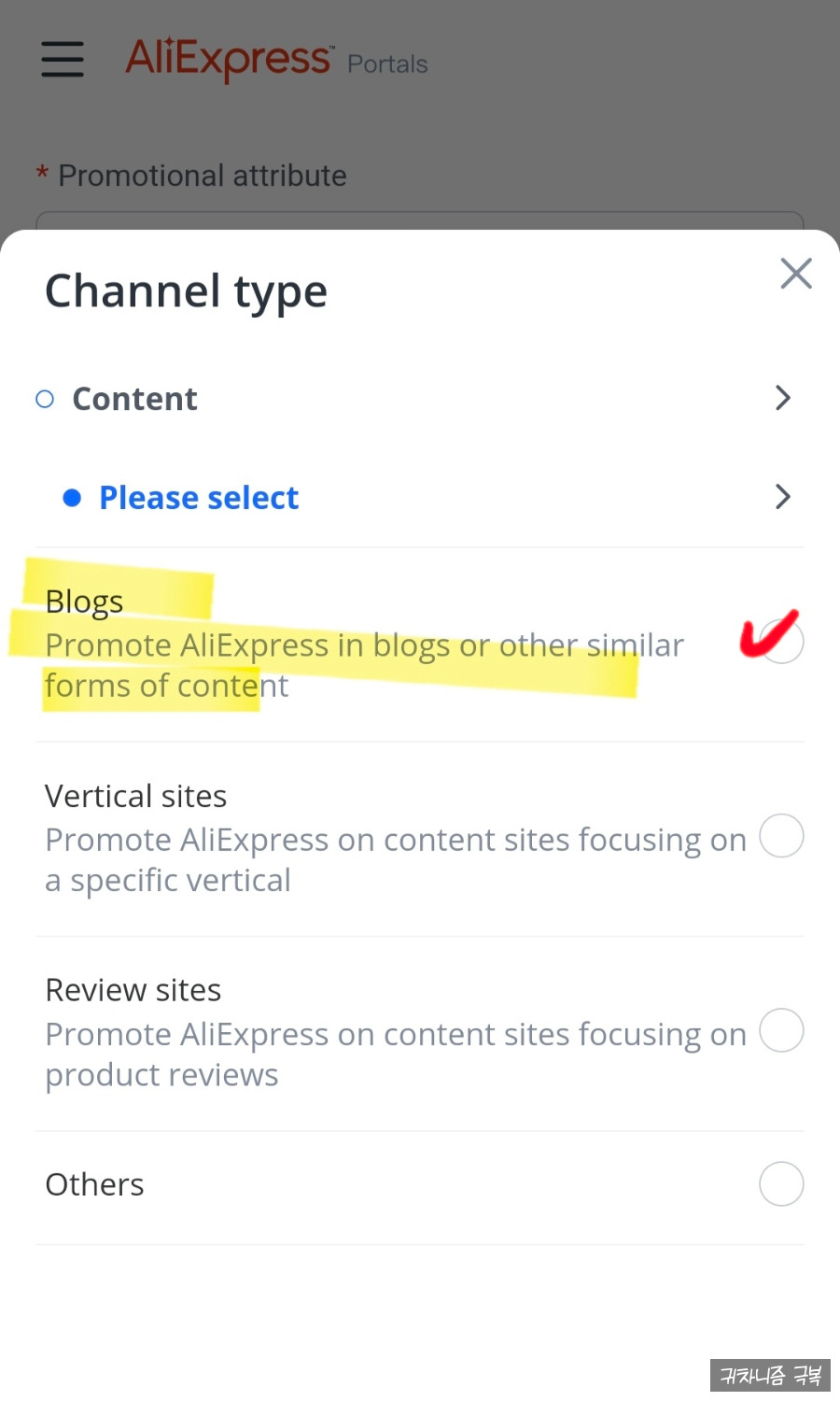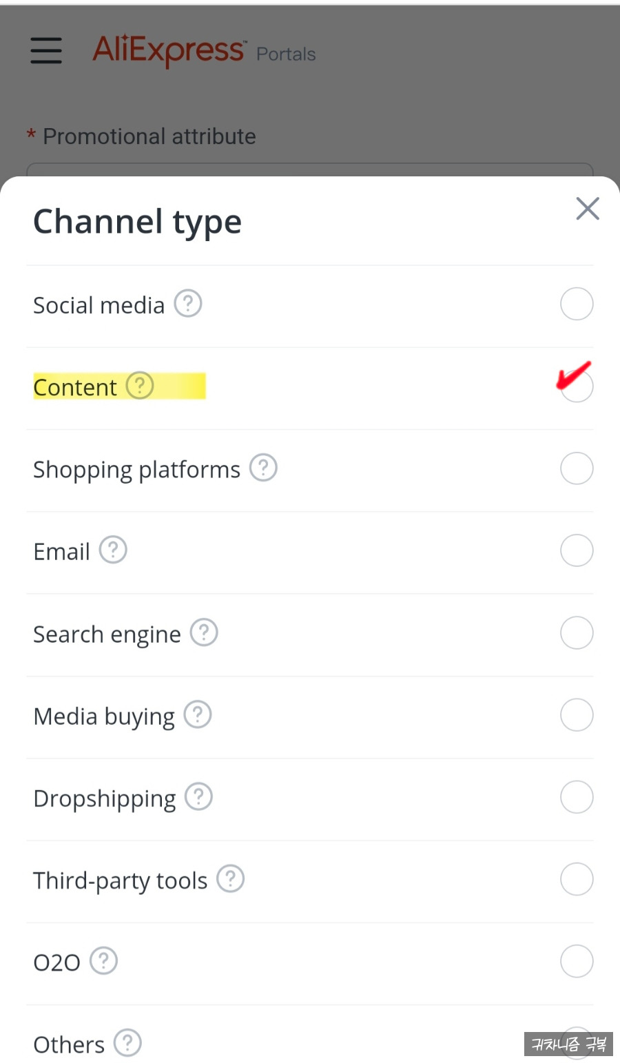 그 다음은 알리익스프레스 어필리에이트를 등록하는 채널 컨텐츠 타입을 선택해야하는 데요. 블로그를 주로 하기 때문에 "Content"를 선택합니다.