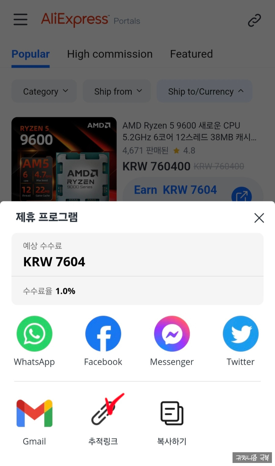 알릭익스프레스로 들어가셔서 상품상단에 있는 공유하기 버튼을 눌러줍니다.