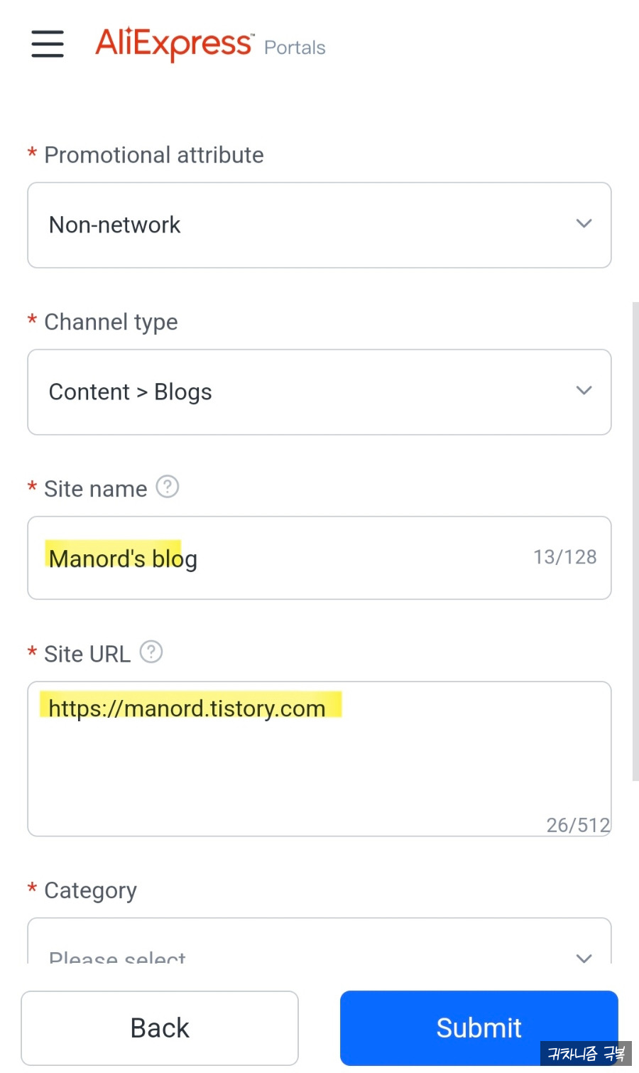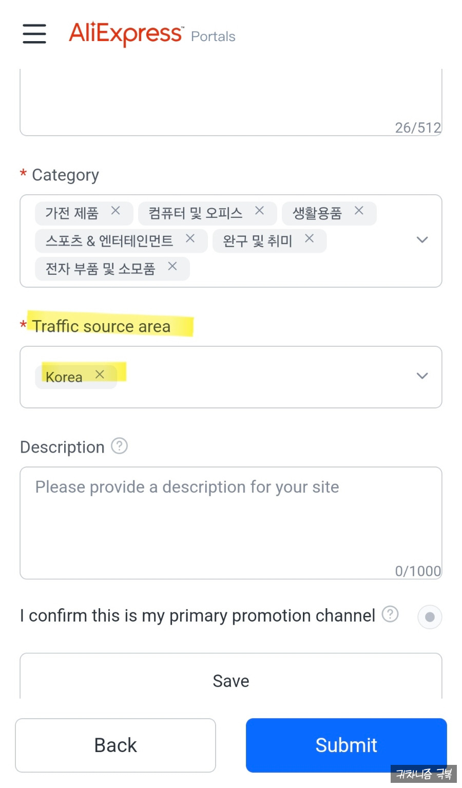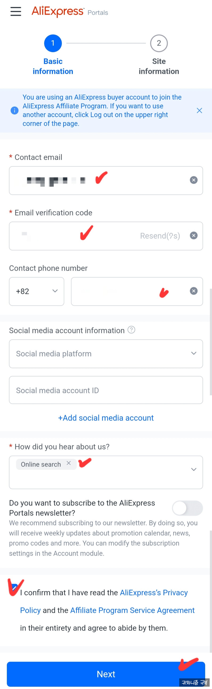 그 다음은 알리익스프레스 어필리에이트 등록을 위한 필수 정보들을 입력해줍니다.