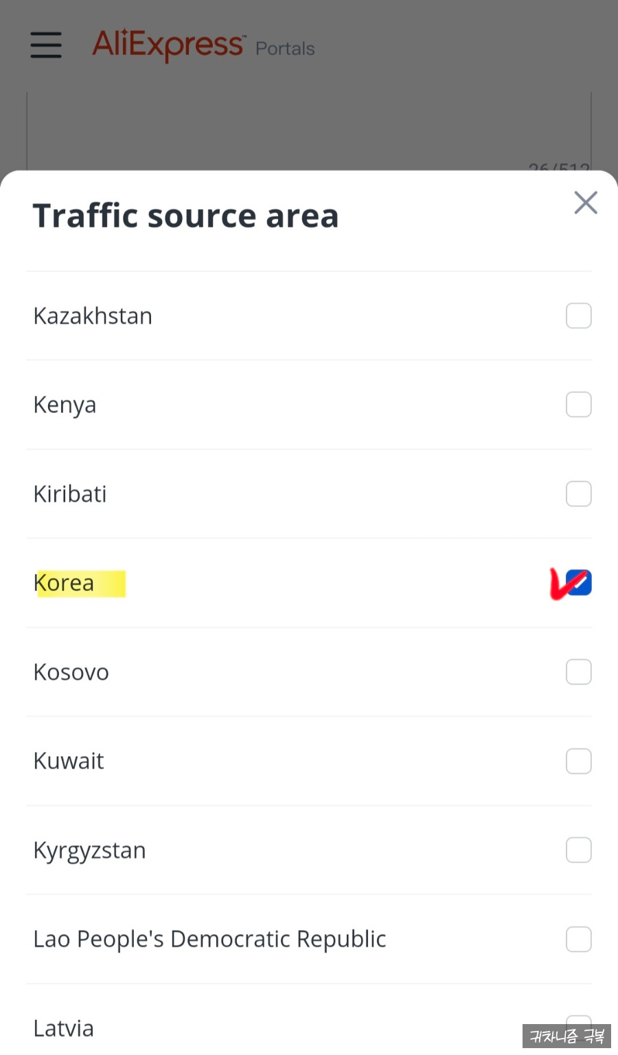 그 다음은, 알리익스프레스의 경우 글로벌한 플랫폼으로 전 세계 사람들이 사용하는데요. 어느 나라에서 발생하는 트래픽인지 지정해줘야 합니다.