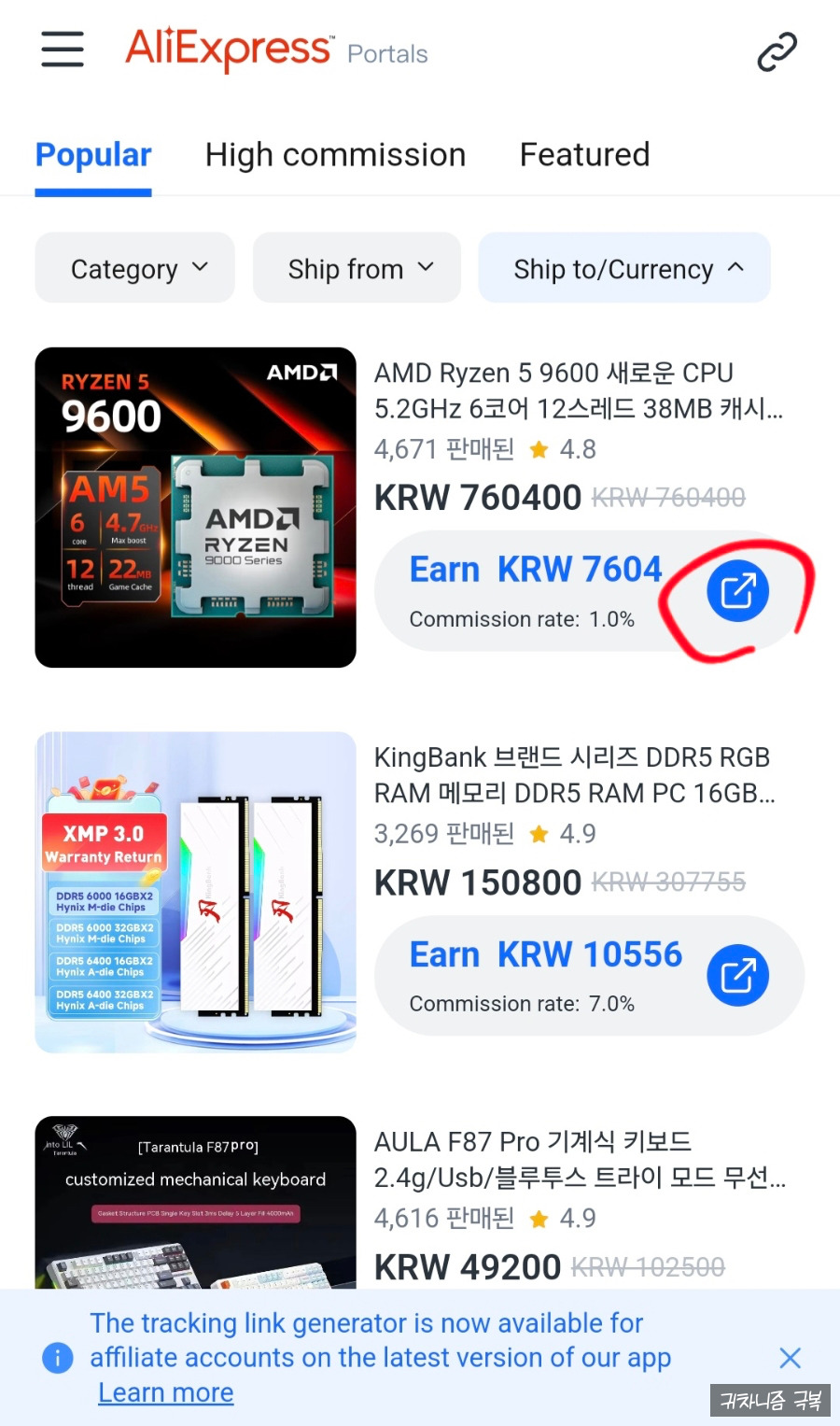 그러면 기존과는 다르게 상품에 대해 받을 수 있는 커미션의 정보가 나옵니다.