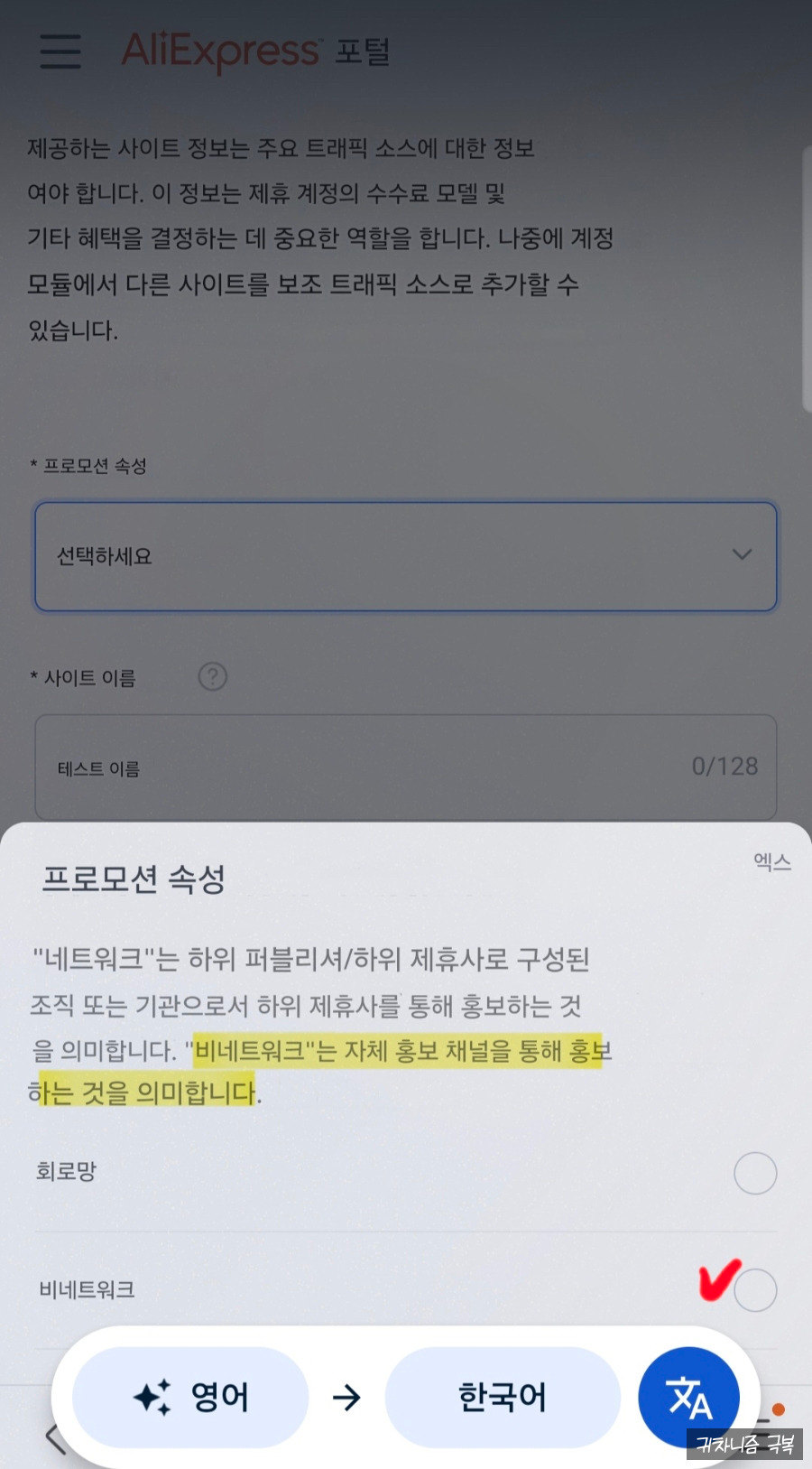번역된 내용을 보면, "프로모션 속성"으로 "Network"는 회사의 개념이고 저 같은 자체 채널로 홍보하는 개인은 "Non-network"를 선택하면 됩니다.
