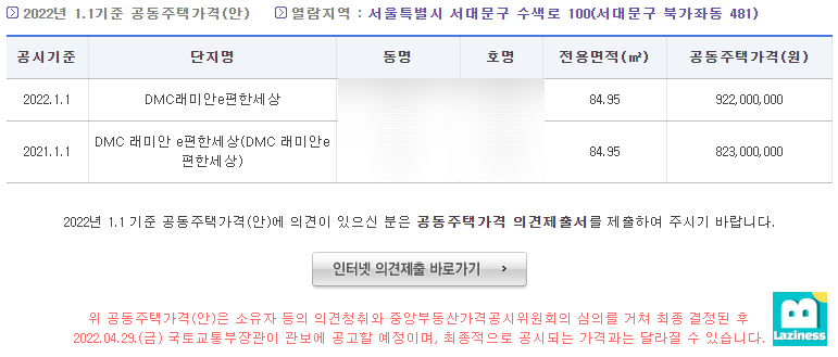 그렇게 선택을 하고 아래에 있는 "공동주택가격(안) 확인" 버튼을 누르게되면 그 아래에 검색된 결과가 나타나게 됩니다.