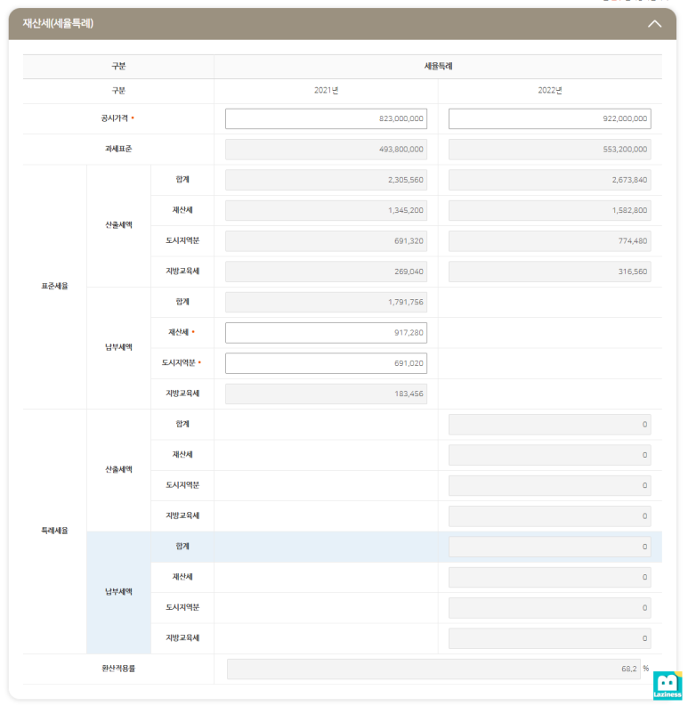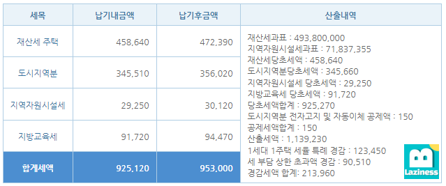 2021년에는 823,000,000원이던게, 2022년에는 922,000,000원이 되었네요.. 약 12%가 늘었습니다.. 급여인상은 2~3% 수준인데 세금과표기준이 되는 공시가격은은 1년 사이에 12%가 올라버렸네요.. 대략 얼마정도 세금이 올랐을지 한번 확인해봐야겠지요?