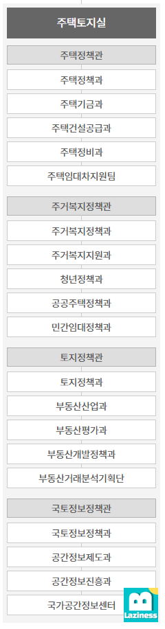 보편적 주거복지를 통한 서민 주거 안정 실현이라고 되어있습니다. 단순히 교통과 관련된 업무만이 아니라 주거와 관련된 부분도 담당하고 있네요. 산하 부서로는 주택토지실로 주택과관련된 업무들을 많이 담당하고 있습니다.