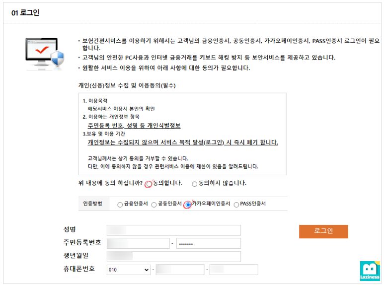 그 다음 하단에 있는 "성명/주민등록번호/생년월일/휴대폰번호"를 입력해 주고 "로그인" 버튼을 눌러줍니다.