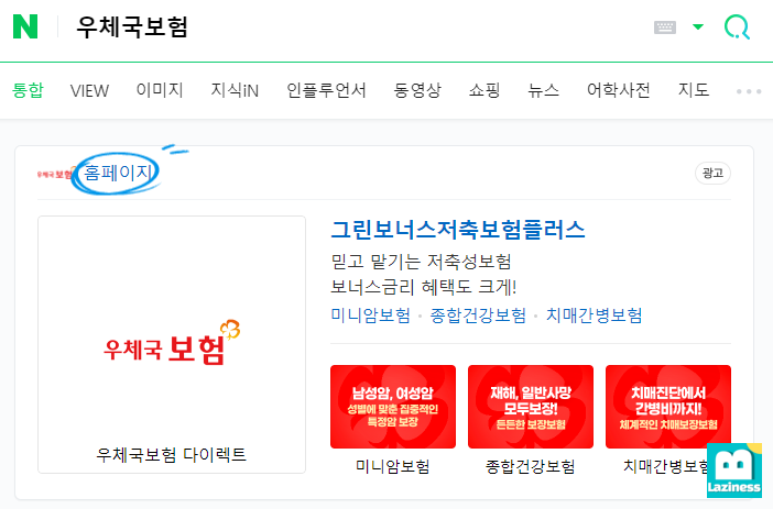 먼저 우체국 보험 사이트로 이동해 줍니다. 가장 쉬운 방법은 네이버에서 검색해 들어가는 것이죠. 검색하고 상단에 "홈페이지"를 눌러주면 들어갈 수 있습니다.