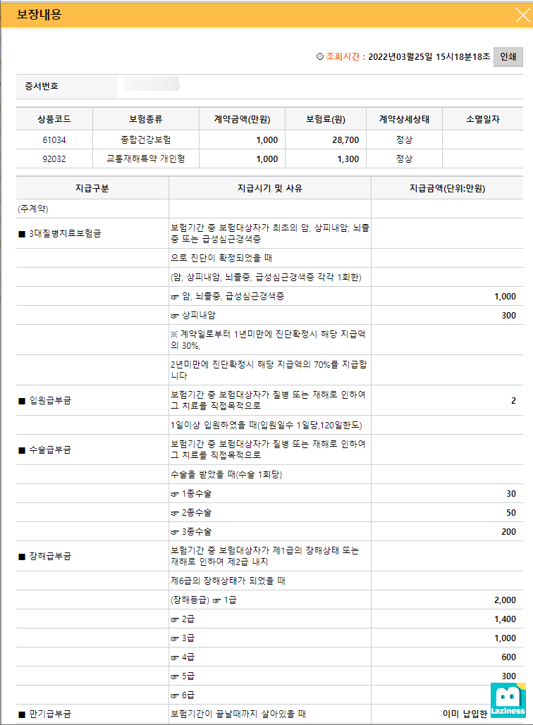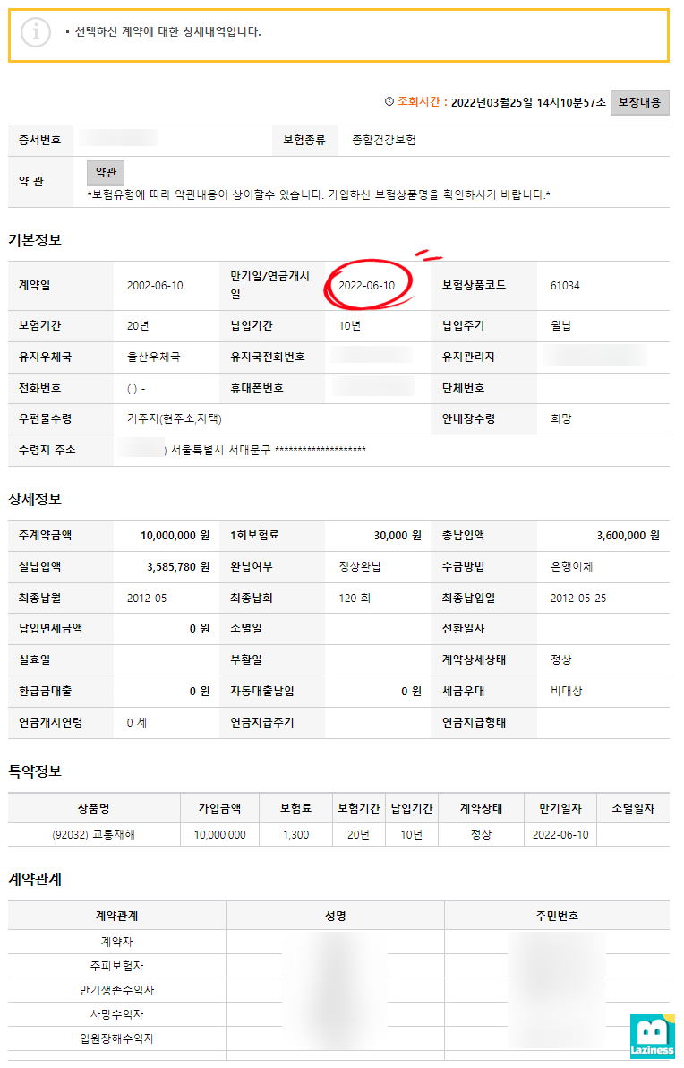 증서번호를 누르면 세부 보험내역으로 이동할 수 있습니다. 저의 보험은 2002년에 계약되어 곧 2022년 6월 10일에 만기가 다가오고 있음을 확인할 수 있습니다. 벌써 20년이 지났네요..