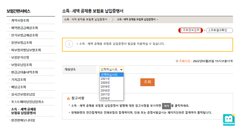 그리고 요즘은 국세청 연말정산간소화 서비스로 보험료 납입증명서를 별도로 출력할 필요는 많이 없어졌지만, 아래와 같이 소득 세액공제용 보험료 납입증명서를 조회하고 출력할 수 있습니다.