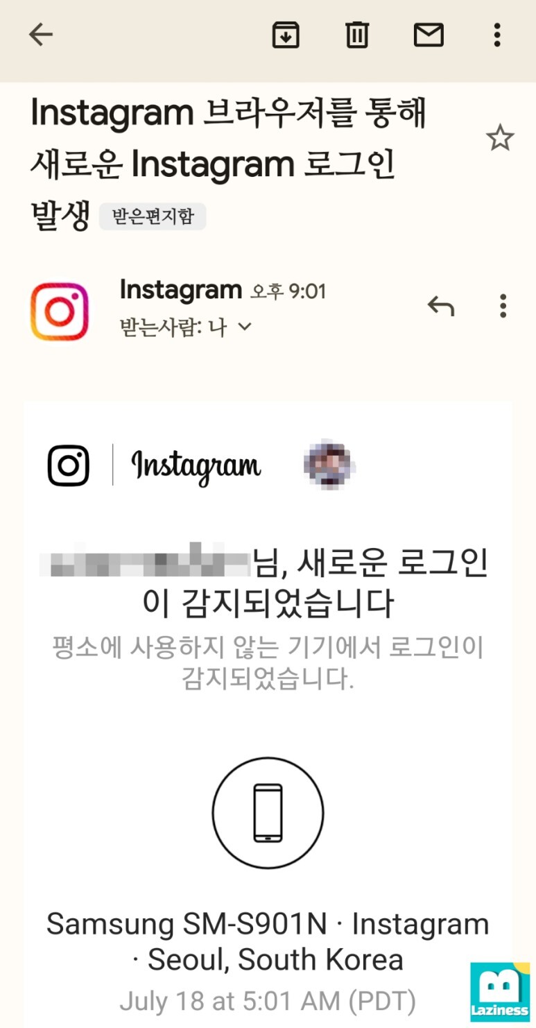 신규기기로 로그인을 진행했기 때문에 연결된 이메일로 새로운 로그인이 감지되었다는 메세지가 옵니다.