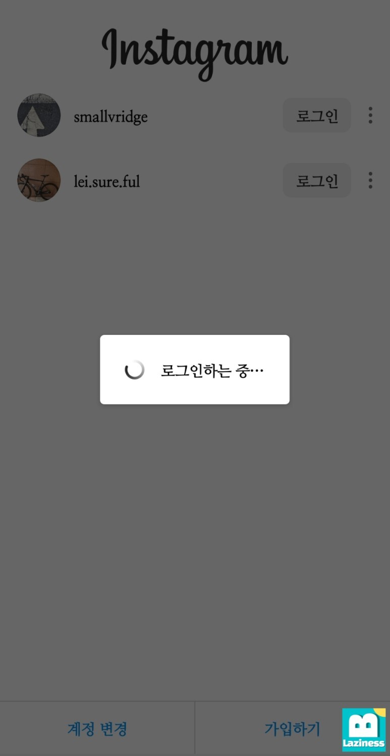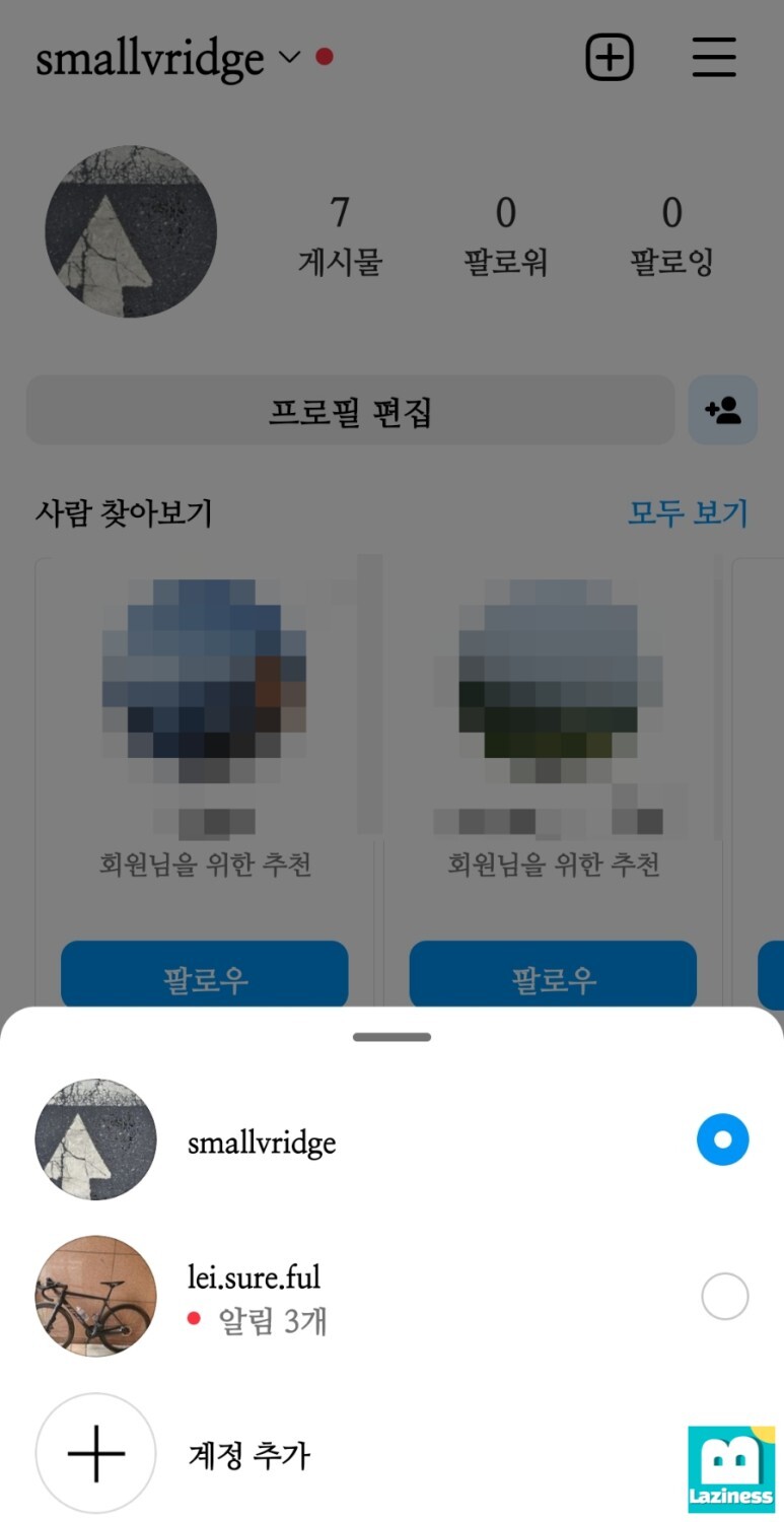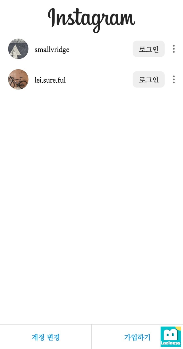 먼저 인스타그램에 접속해서 상단의 계정부분을 눌러주면 아래와 같이 핸드폰에서 접속할 수 있는 인스타그램 계정들이 나타나는데요.