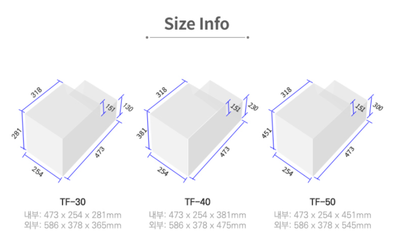 승용차 트렁크도 모양이 다 다르니, 용량별 사이즈는 아래 표를 통해 확인하세요.